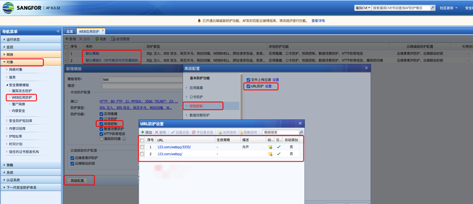 方法二(推荐):需要在URL防护里配置为允许webqq/3333/,URL防护的优先级最高,然后在自定义WAF里配置为拒绝: