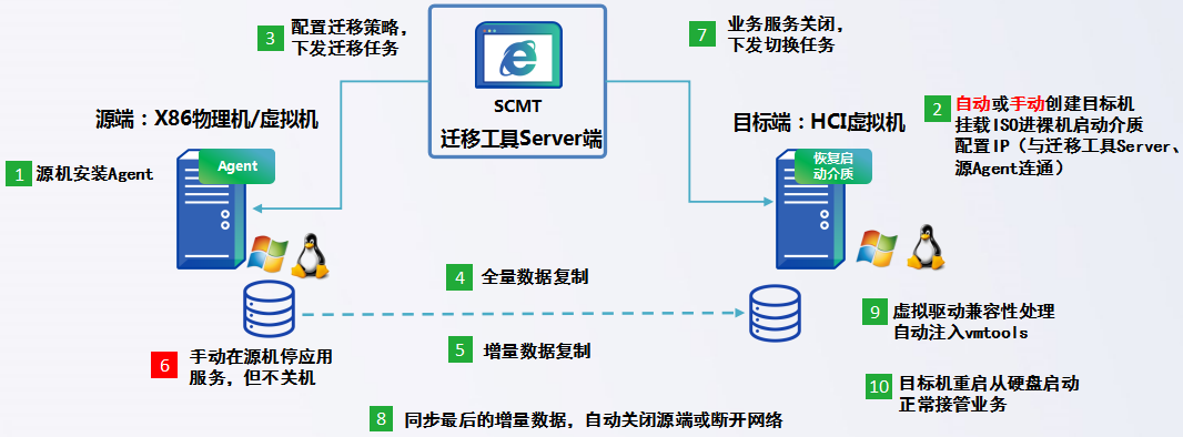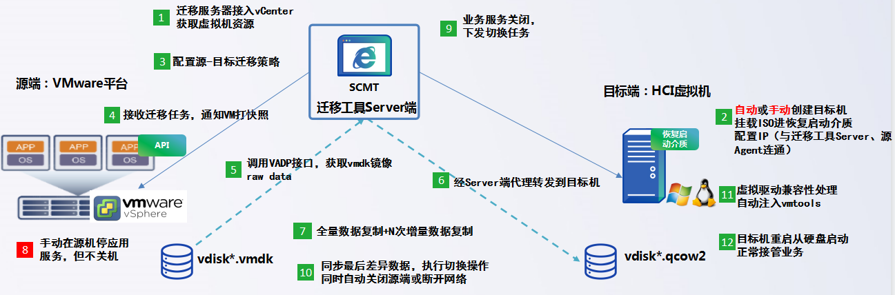 源端是VMware平台时,可利用VADP接口实现虚拟机免代理迁移;源VMware虚拟机不需要装Agent;通过VMware快照+CBT方式获取全量和增量数据,数据迁移时流量经过迁移Server端代理转发;迁移结束后,HCI平台上目标机自动进行驱动兼容性处理,并注入vmtools。