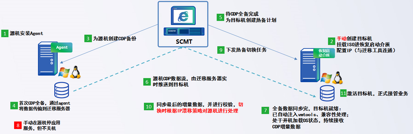先要CDP,源机装agent,并完成整机CDP备份;后续IO实时同步到迁移服务器。