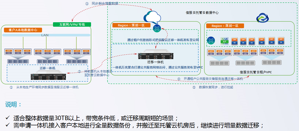 需申请一体机接入客户本地进行全量数据备份,并搬迁至托管云机房后,继续进行增量数据迁移。