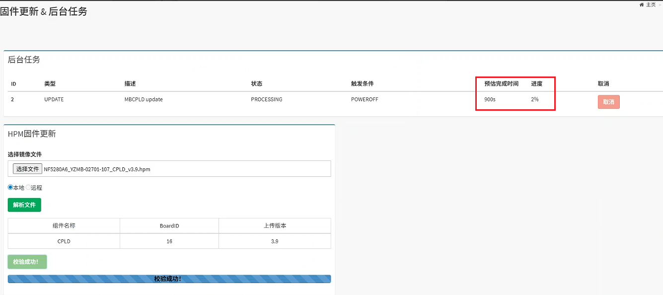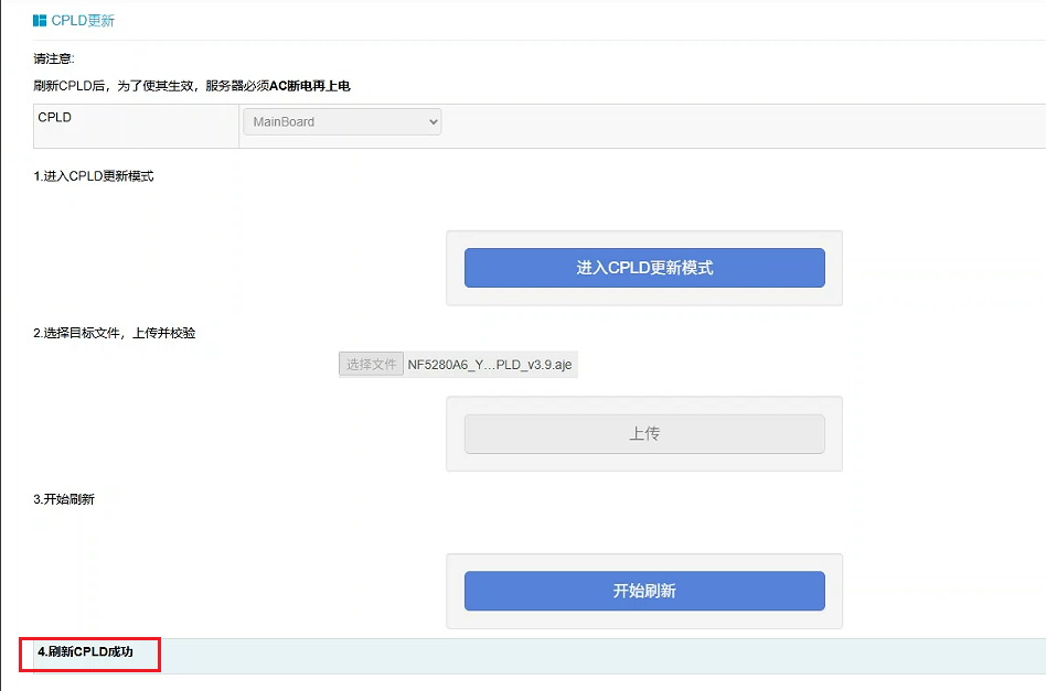 8、校验完成后后,选择“开始刷新”升级,注意下方升级进度条,升级完成后会提示“设备已重启”,此时BMC升级完成。