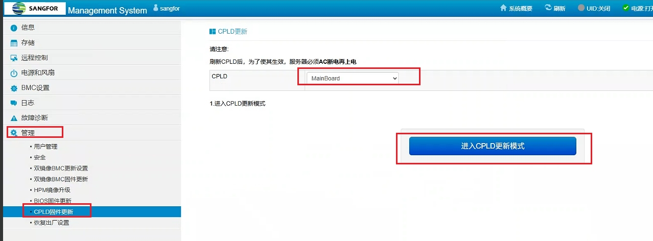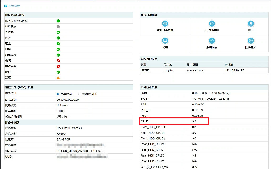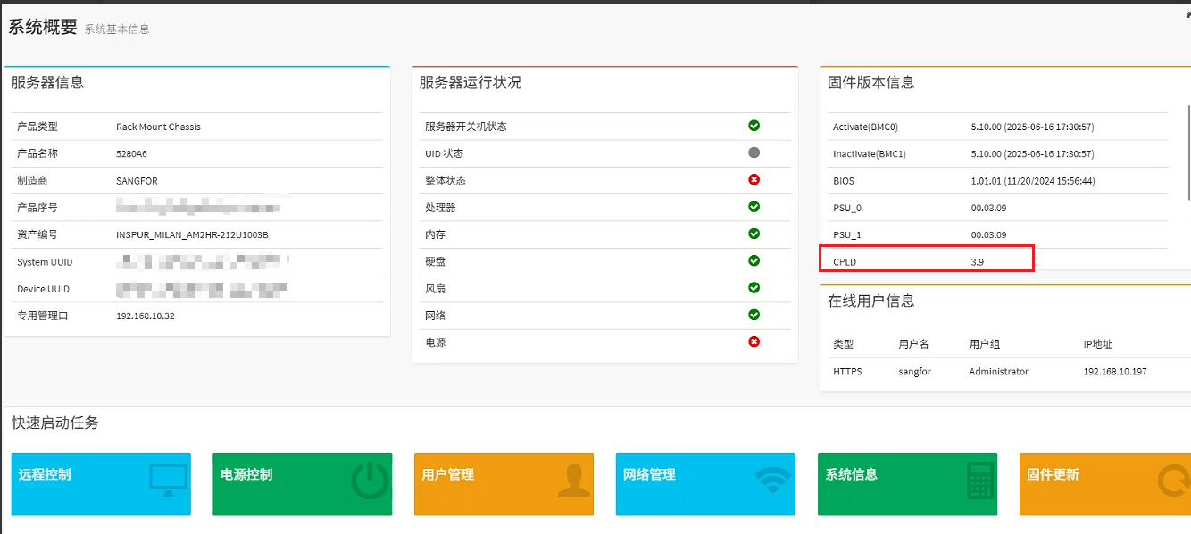 1、BMC升级完成后,等待2-3分钟后BMC自动重启完成,再用IPMI口IP地址(https://机器实际IP地址)登录WEB界面,登录用户名 admin 登录密码 admin (新用户名为sangfor,新登录密码为S#AN$6fo81r)。