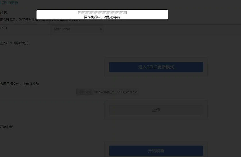 3、选择加载要升级的 BIOS 升级文件,升级文件选择完成后,再点击“上传”,上传成功后,点击开始刷新,升级过程注意查看下方升级进度条情况,升级完成后蓝色和绿色进度条加载完,显示注意:BIOS更新成功,建议服务器AC断电。