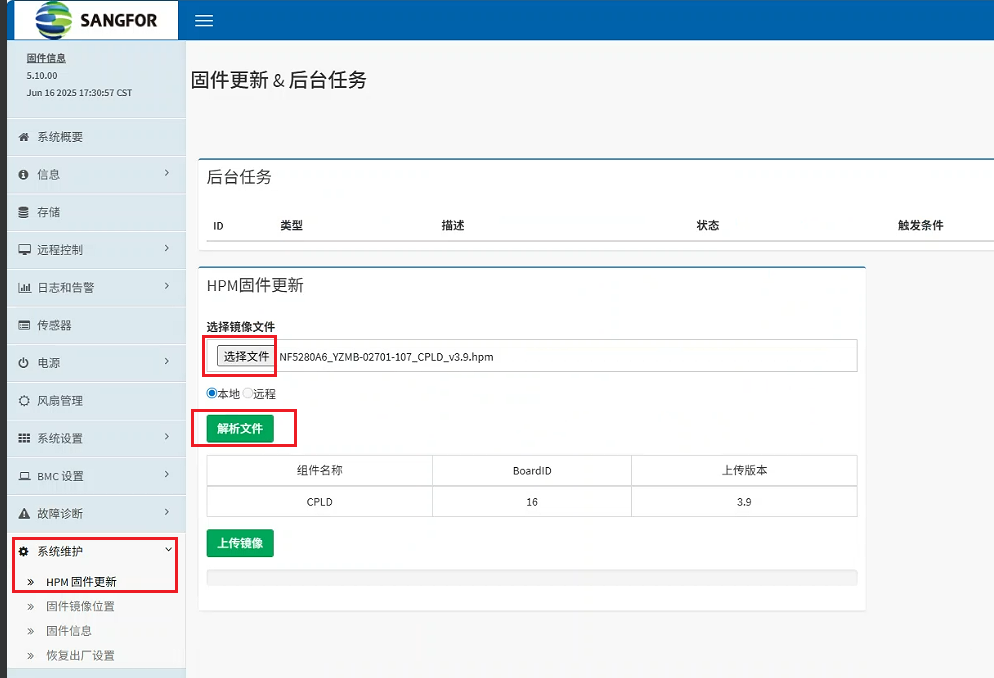 7、进入固件升级后,点击“选择文件”,加载要升级的BMC 文件,选择“开始固件更新”进行 BMC 升级。