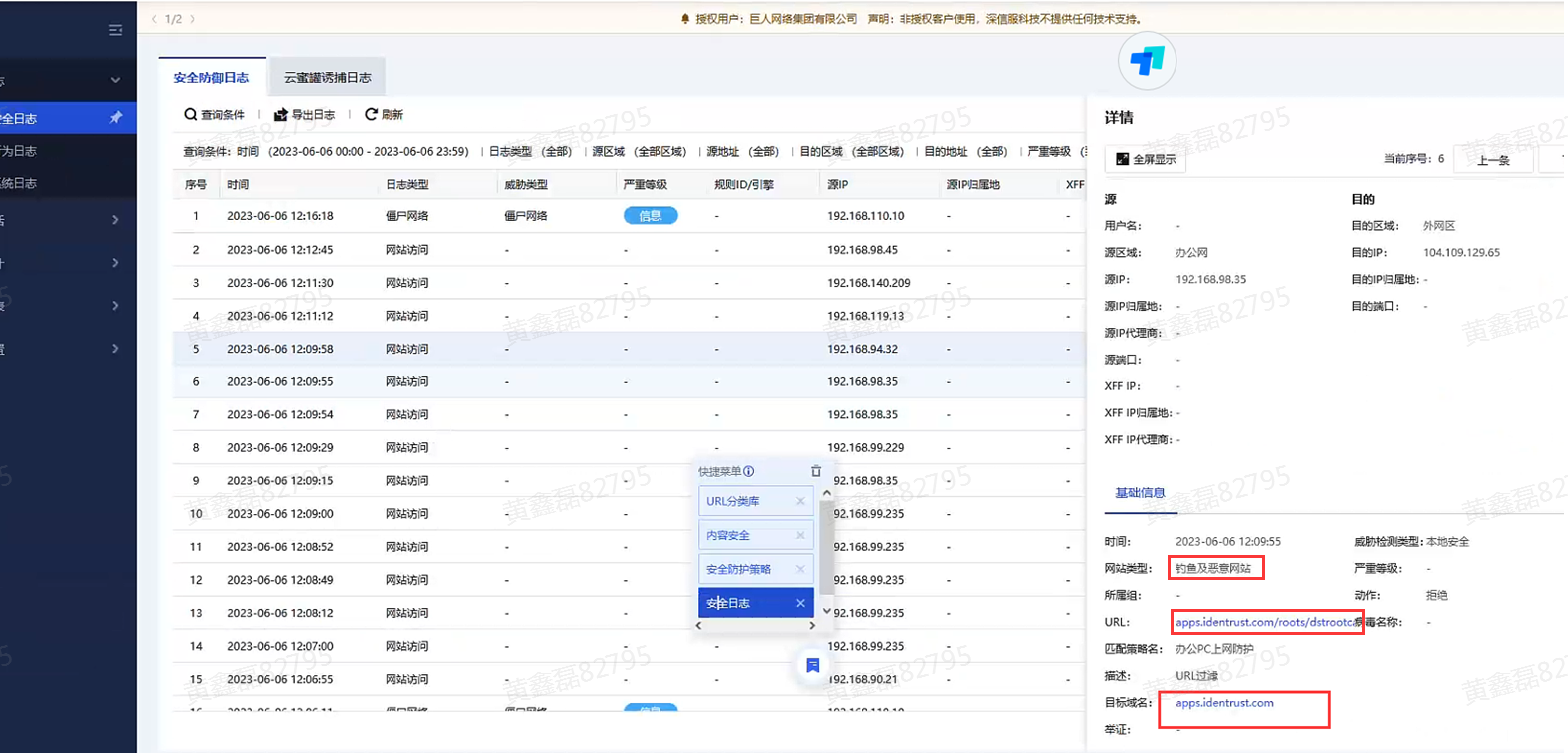 1、查看拦截日志,发现是URL过滤拦截,且此URL被AF判断为钓鱼网站