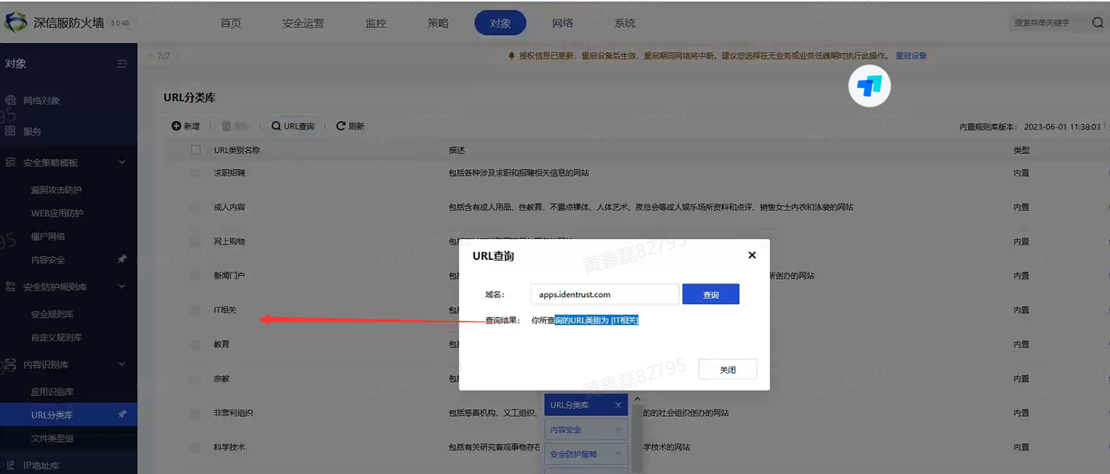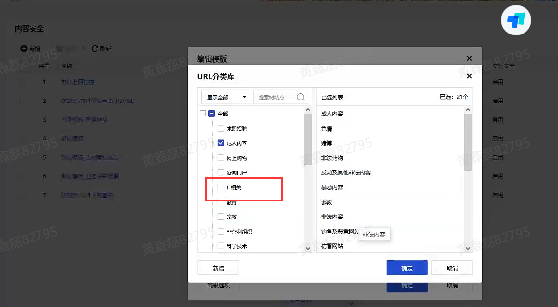 3、查询安全日志里面拦截的安全策略应用的内容安全模版里面的URL过滤没有勾选IT相关