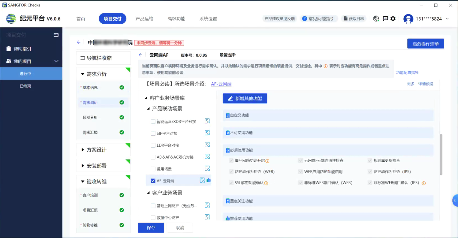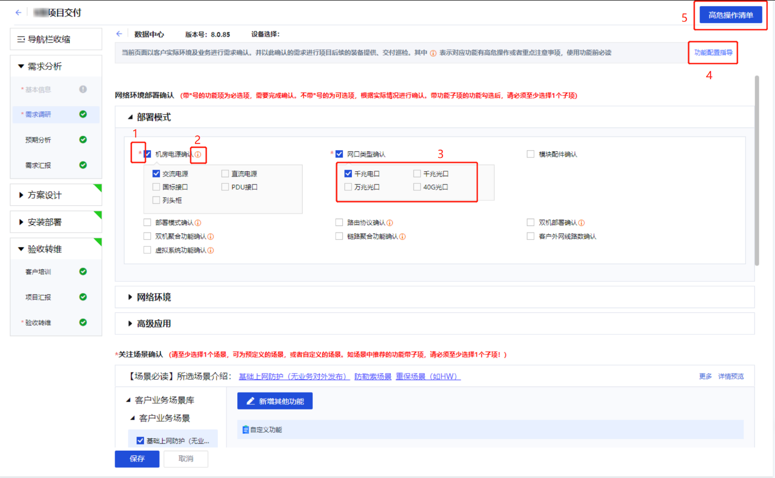 2. 点击<功能确认>进入对应场景功能配置。勾选【网络环境部署确认】中相关的功能,并勾选对应选项。标*为必填项