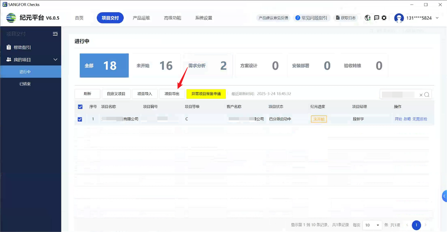 1. 在可联网环境(自己的电脑或客户的都可以,但是需要联网的才行):在【我的项目】-【进行中】页面,点击<选择需要交付的项目>,选择完成后,点击【项目导出】,即可得到项目文件“exported_data.zip”