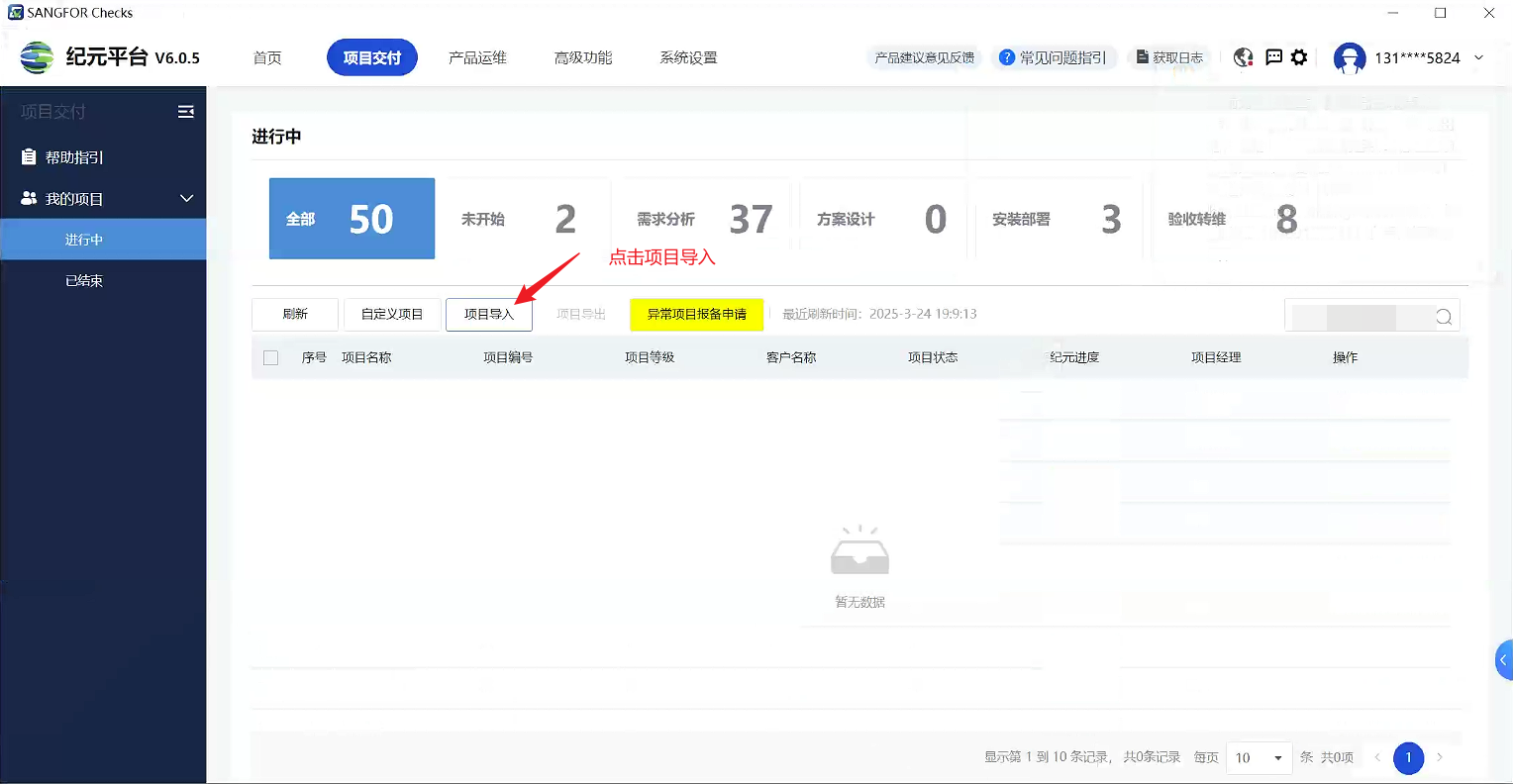 2. 在离线环境中(客户的不可联网的电脑),在【我的项目】-【进行中】页面,点击【项目导入】,选择前面导出的“exported_data.zip”文件,导入后可以看到该项目