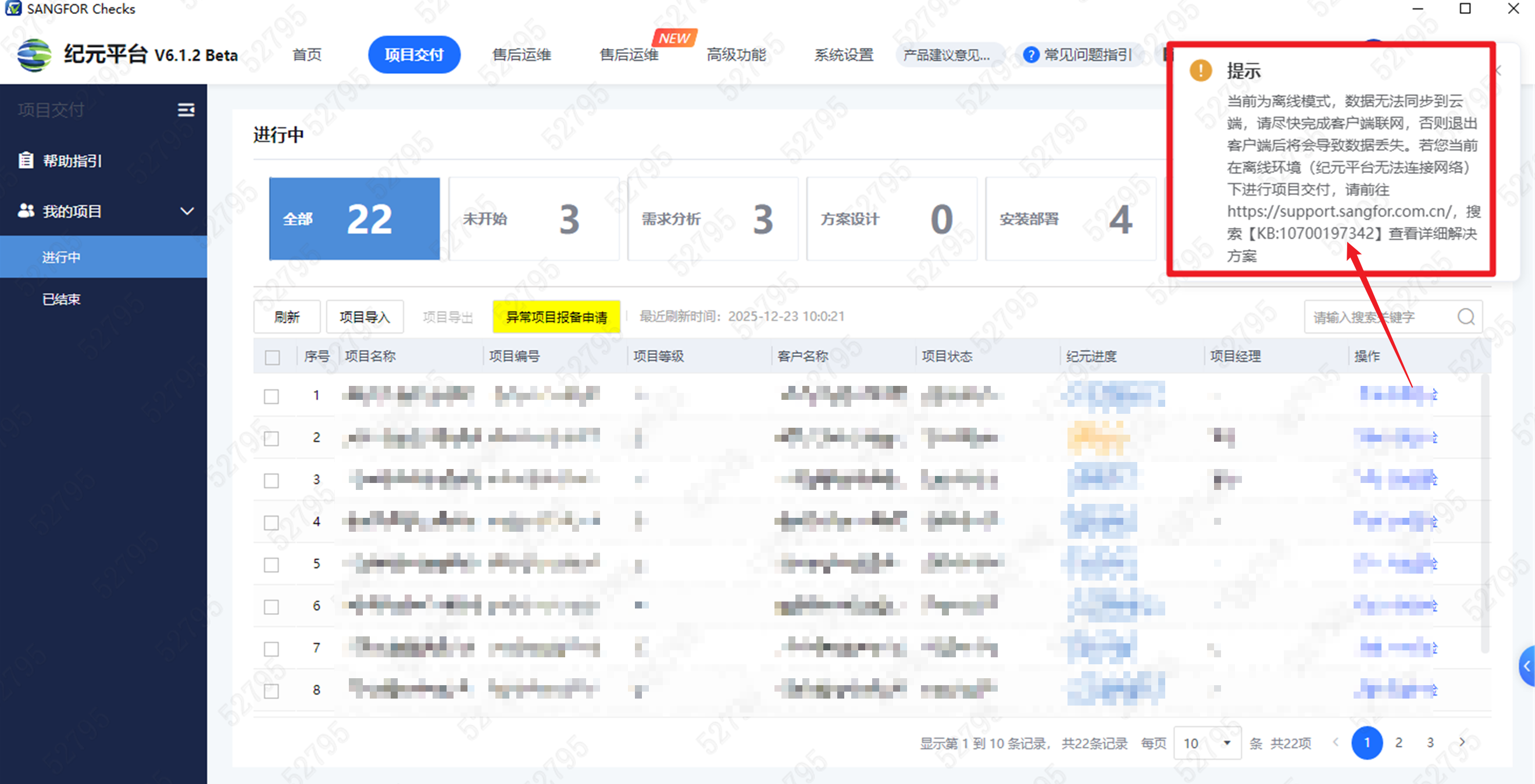 当客户环境为离线环境时,右上方会不定时弹出,“当前为离线模式,数据无法同步到云端,请尽快完成客户端联网,否则退出客户端后将会导致数据丢失。若您当前在离线环境(纪元平台无法连接网络)下进行项目交付,请前往 https://support.sangfor.com.cn/,搜索【KB:10700197342】查看详细解决方案”