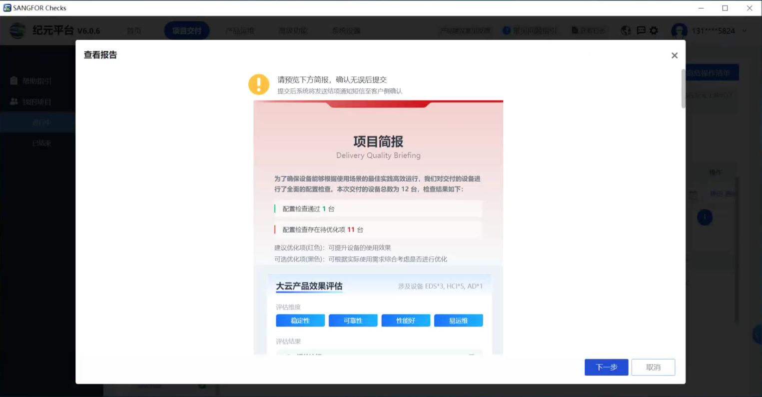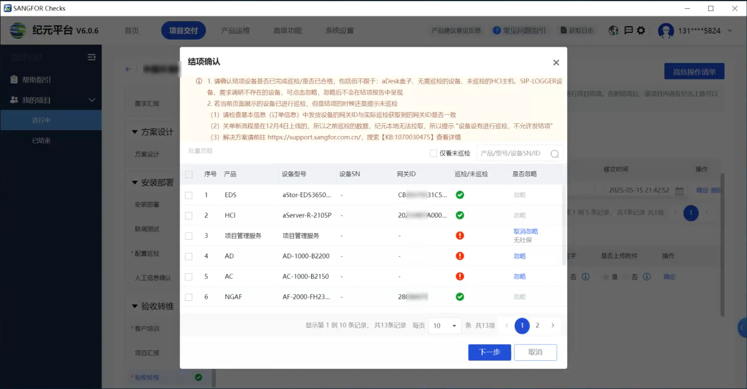 1. 点击【发起结项】会进行结项确认,检查当前交付设备的巡检情况