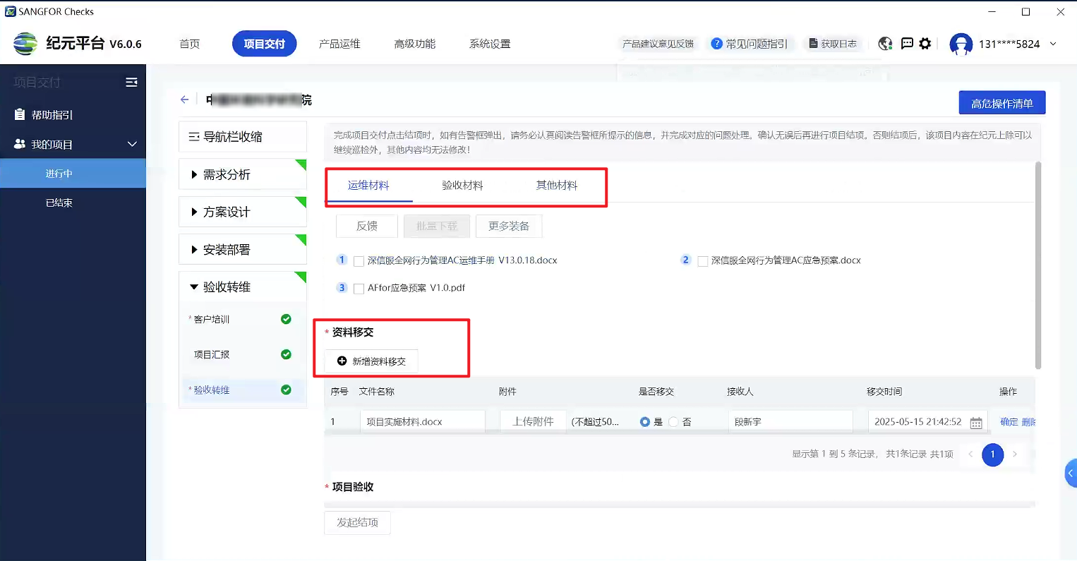 该阶段,一方面是按产品线精确提供运维材料及验收材料,另一方面,提供【材料移交】的录入 ,录入后会自动同步到iCare/PRM系统中。装备材料包括如下内容