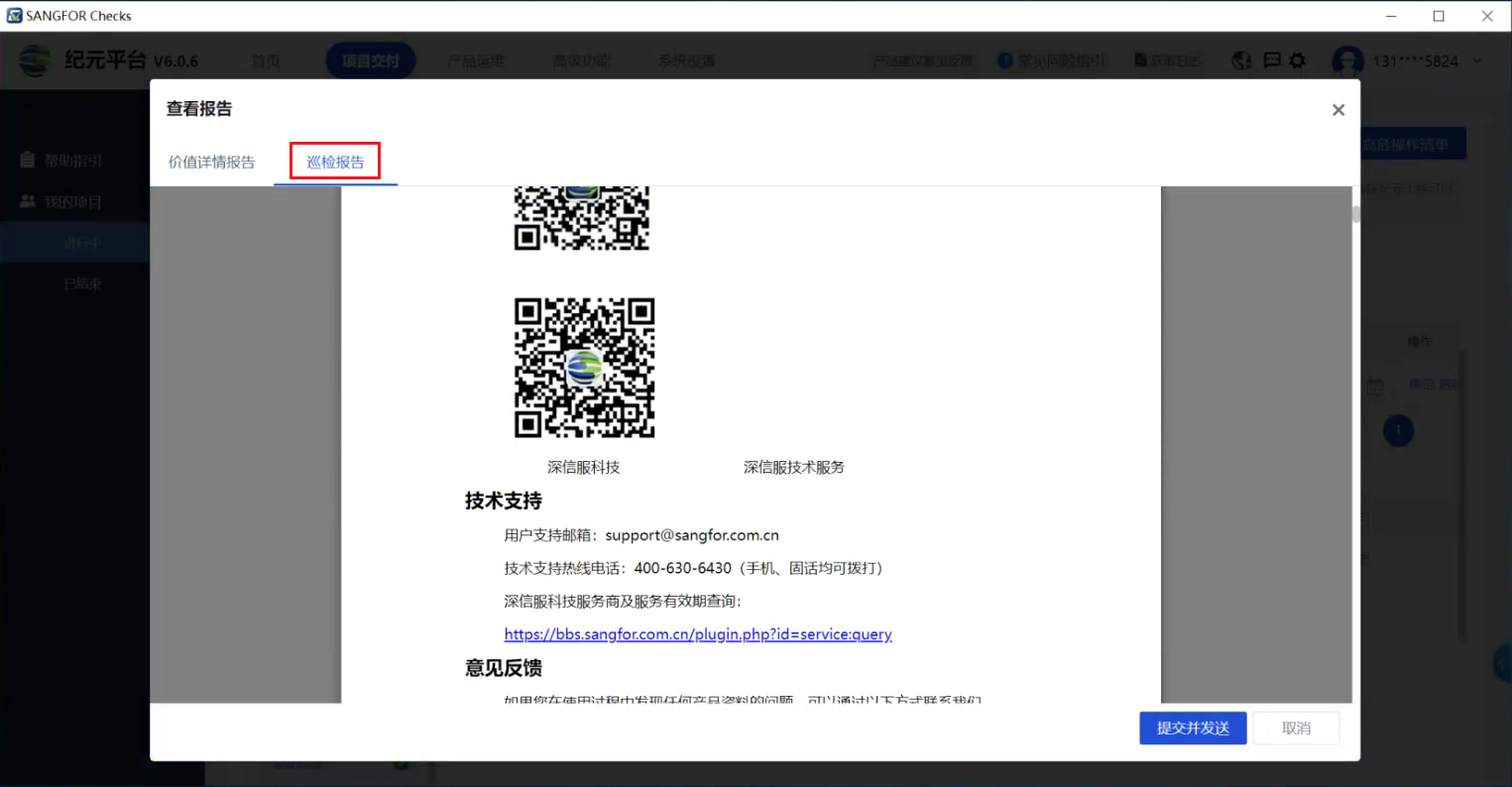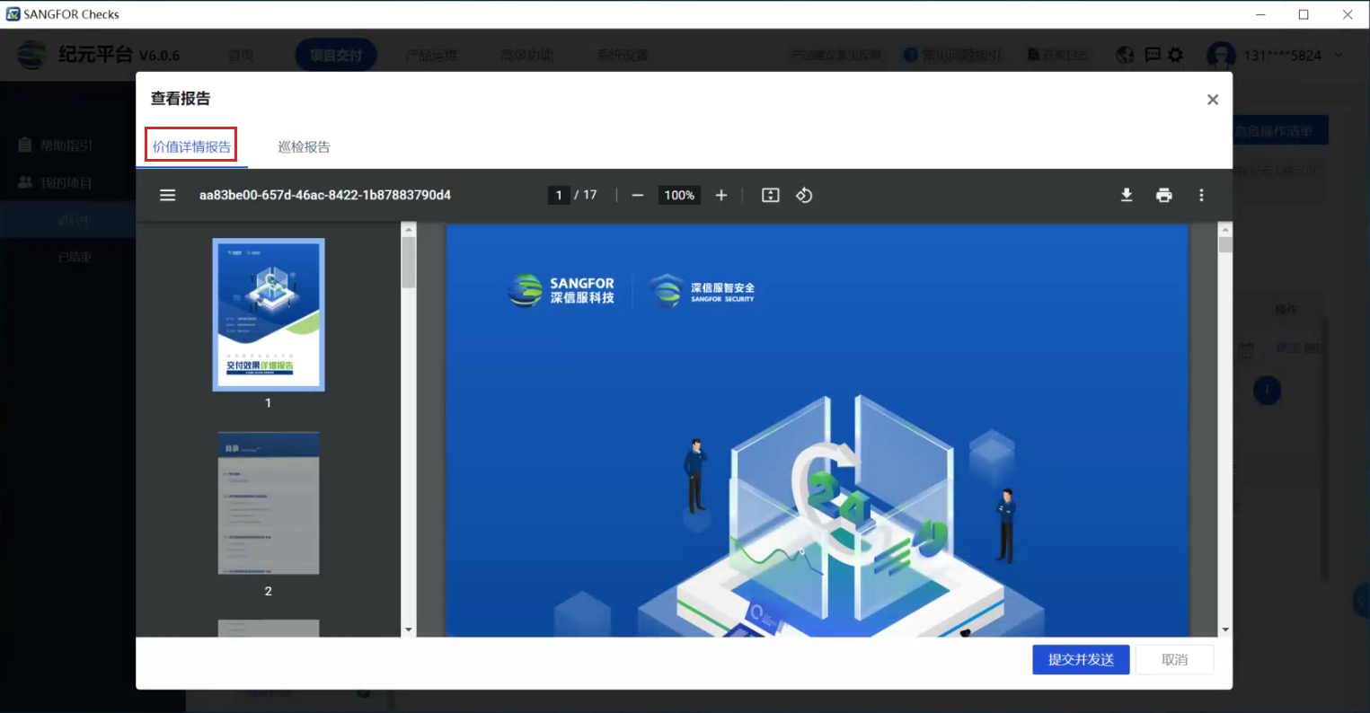 3. 再次点击【下一步】会展示《价值详情报告》和《巡检报告》,点击【提交并发送】客户会收到《项目简报》《价值详情报告》《巡检报告》,总计3份报告