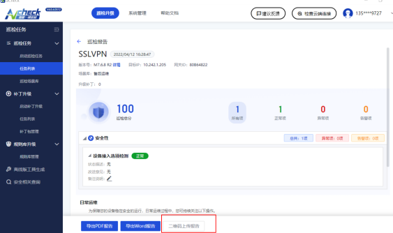 2. 报告下载:选择【巡检升级】-【任务列表】页面,点击操作栏中<报告>进入巡检报告。报告页面底部可导出PDF报告以及Word报告
