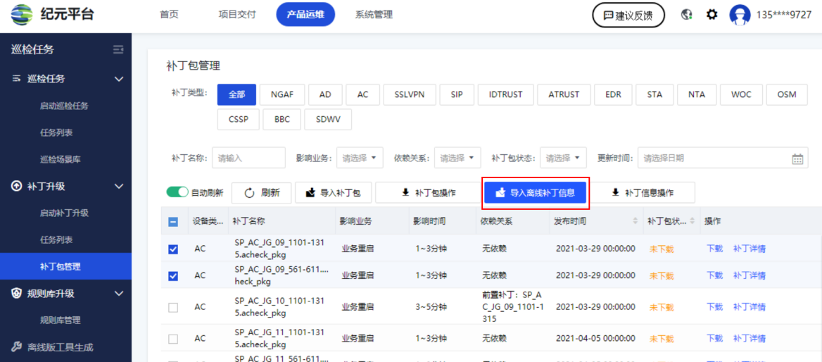 再导入离线纪元平台:【巡检升级】-【补丁升级】-【补丁包管理】页面,点击<导入离线补丁信息>。