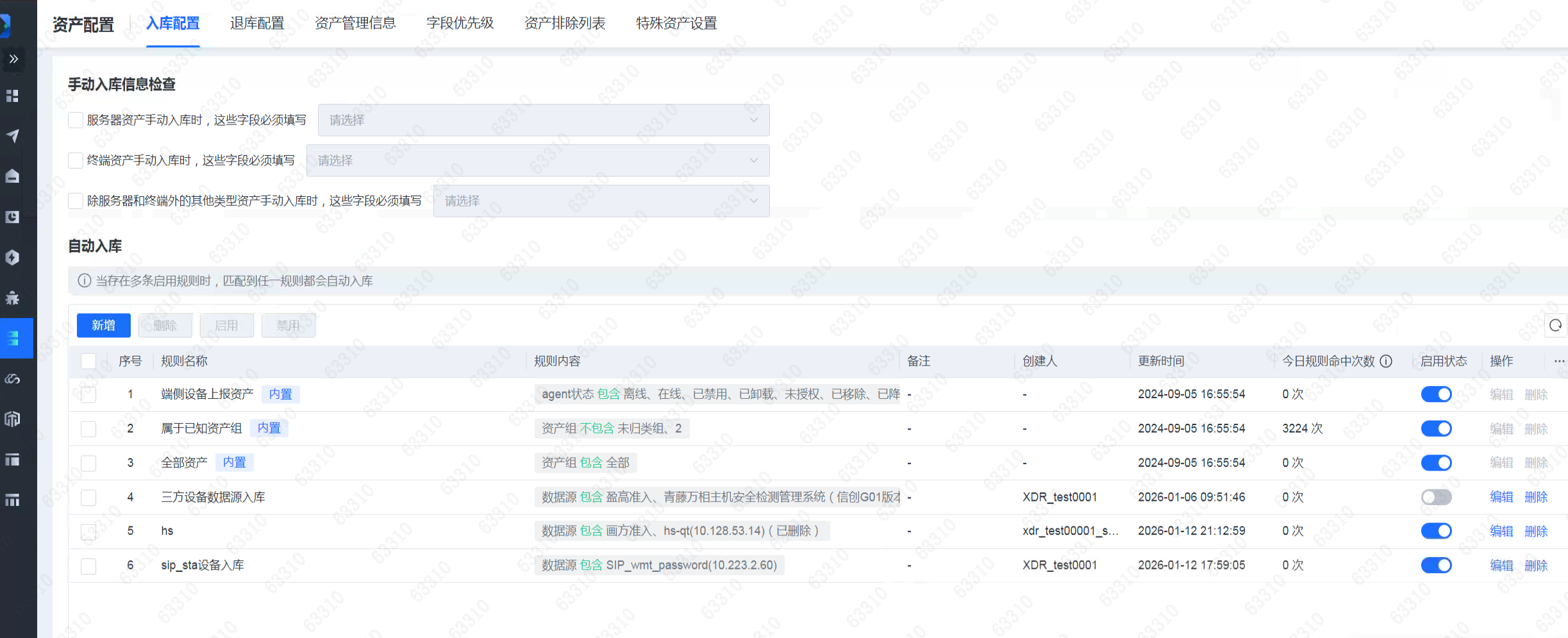 入库信息检查:可配置必须填写的字段,包括资名称、主机名、资产类型、责任人