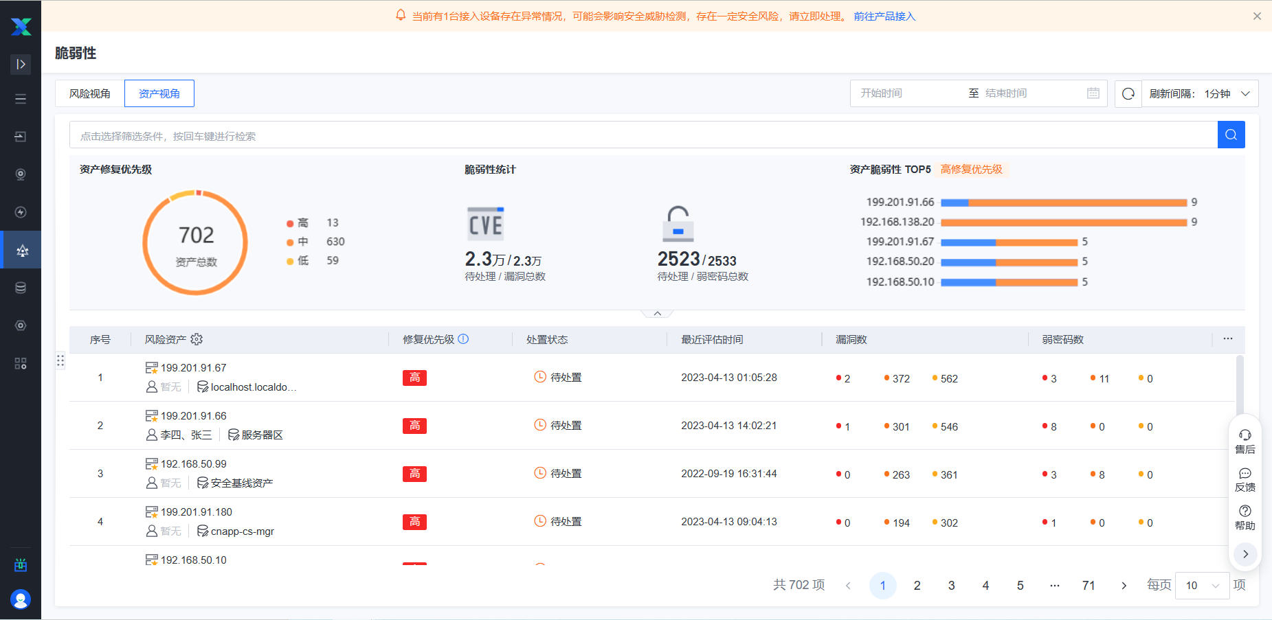 资产列表以资产维度展示修复优先级、漏洞/弱密码梳理,提醒优先处置高修复优先级资产。