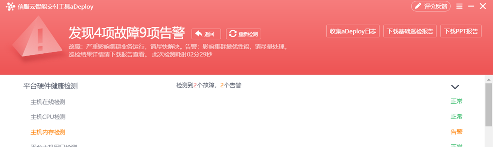 - 巡检完成后,界面会直接显示巡检结果。如下图所示,不同颜色表示不同的级别,绿色表示正常,黄色表示告警,红色表示故障,可直接在此界面查看巡检结果信息。