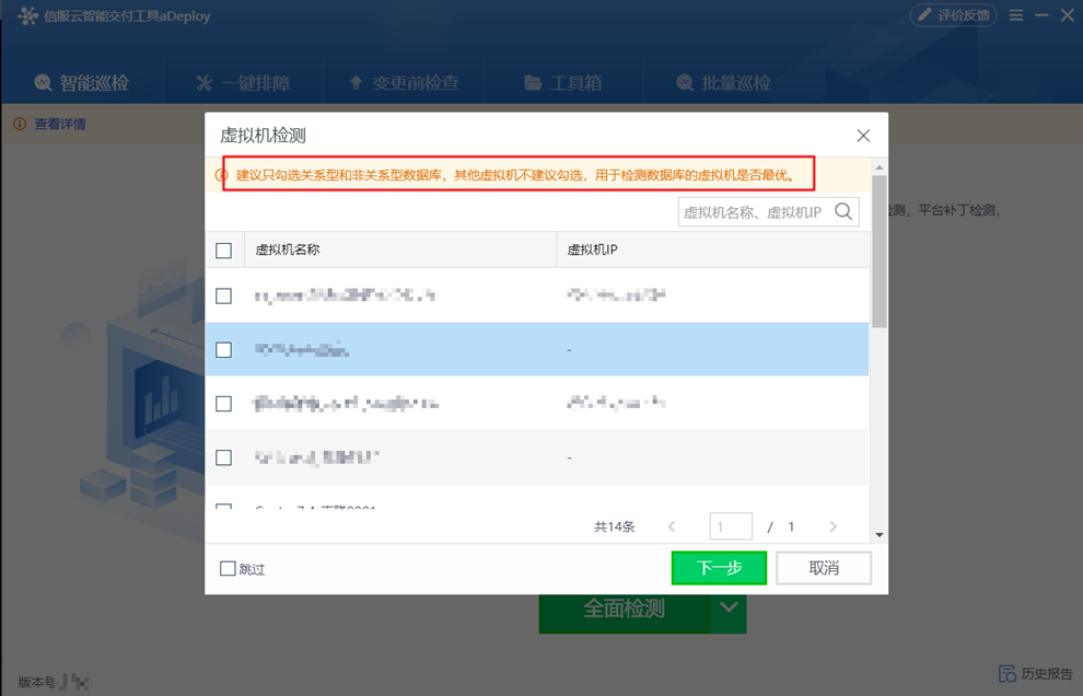 - aDeploy 工具还可以对集群进行全面检测,在首页输入需要巡检的超融合平台集群IP 、 admin 密码,点击<全面检测>,弹出如下界面的检测项是选择重要虚拟机进行检查,确保其满足超融合最佳实践,以此保障重要虚拟机性能和可靠性,推荐选择关系型数据库虚拟机。此处勾选需要检测的虚拟机,若不需要检测虚拟机,可勾选左下角“跳过”,即可跳过虚拟机检测,若需要进行检测,选择对应的虚拟机后可安装虚拟机分组名称作为虚拟机的分类标签进行检测。