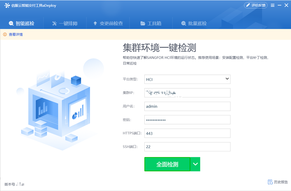 - 在 aDeploy 工具首页,平台类型选择“ HCI ”,输入需要巡检的超融合平台集群IP 、 admin 密码,如果集群环境使用了 NAT 功能,则输入对应协议端口号,点击<全面巡检>,即可对此 HCI 平台进行巡检。
