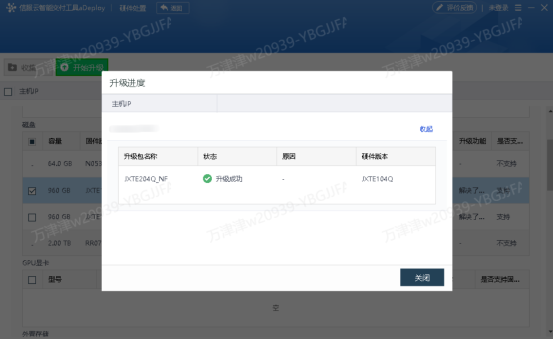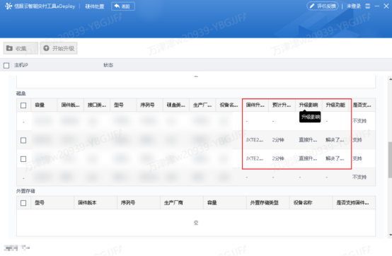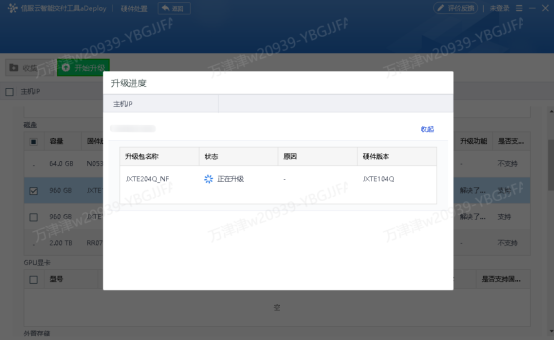 3.执行完成后,会把所有的硬件信息展示在界面,其中有一栏写明了是否支持升级固件。 4.支持升级的硬件会有预计升级时间、升级影响以及升级功能信息。请仔细阅读!注意:升级前请先咨询技术支持并详细查看升级影响,确保对客户的业务没有影响,再进行操作!5.勾选一个硬件前方的勾选框,点击上方的开始升级6.弹窗升级进度7.升级完成