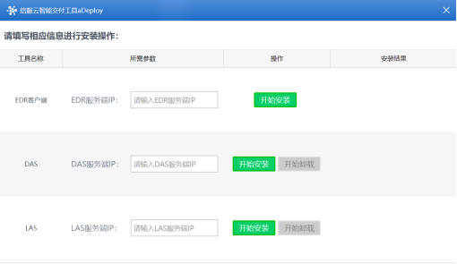 - 然后输入EDR、LAS、DAS的服务端IP,点击<开始安装>,等待安装成功即可。