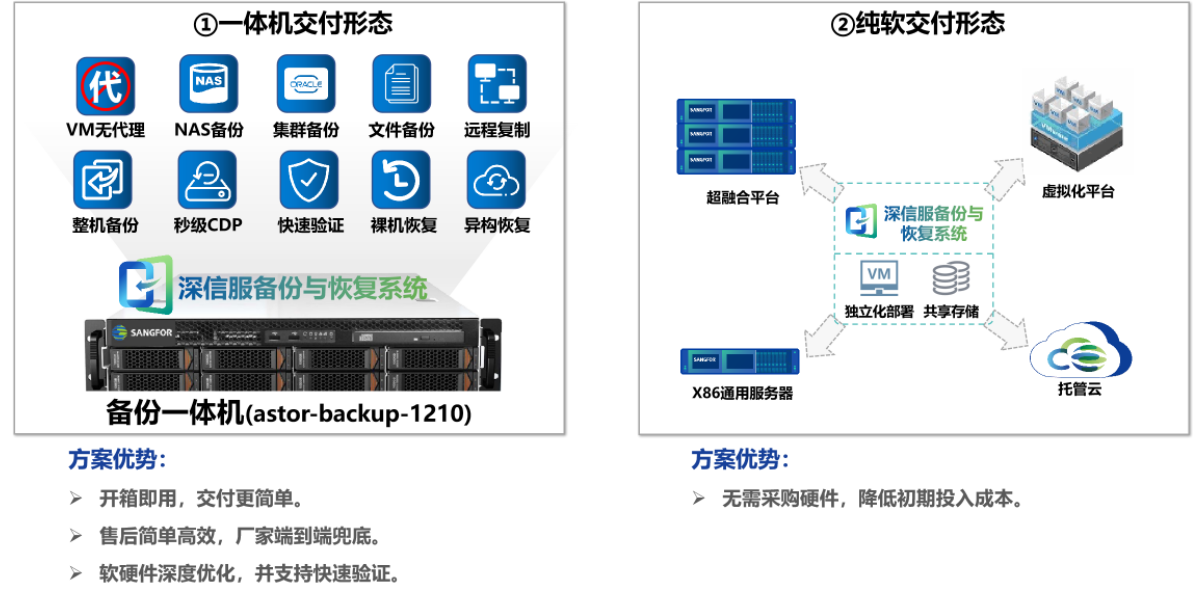 深信服备份一体机,内部嵌套了深信服企业级备份与恢复系统,为适应新的备份需求,集成多项创新思想,通过完美的技术整合;不仅可实现优秀的备份功能,同时提供了稳定、可靠、高性能的存储系统。深信服备份一体机实现了高性价比,适用于云、虚拟化、物理多种环境,同时搭配实时备份、重删压缩、异构恢复、远程复制等功能,给用户打造备份验证演练恢复全流程闭环的灾备建设标准,助力用户一站式解决数据安全保护需求。