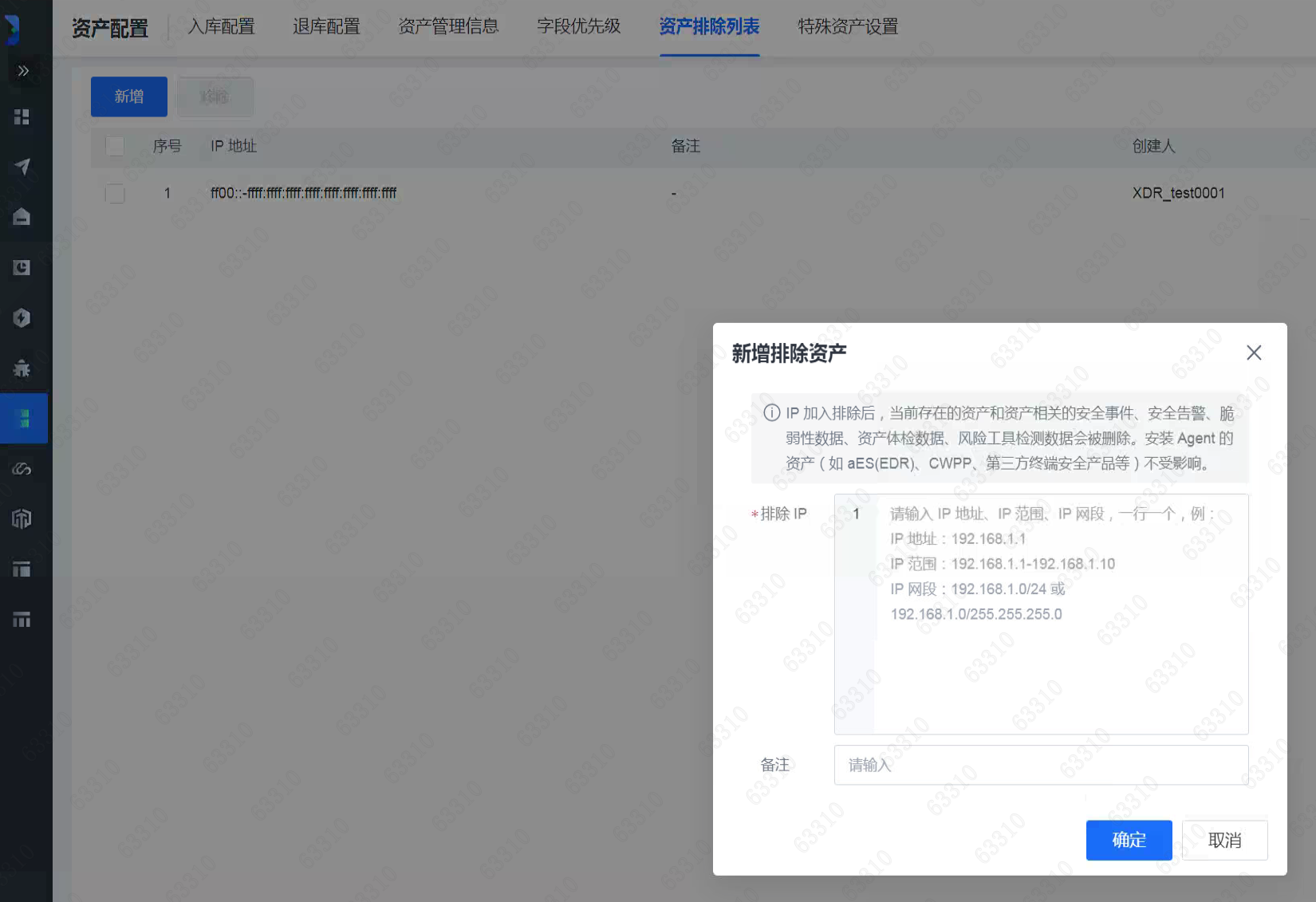 添加到此处的资产 IP 不会纳入平台管理,不会生成相关的事件、告警等威胁信息。安装 Agent 的资产(如 AES、EDR、CWPP、第三方终端安全产品等)不受排除列表影响,仍会受到平台管理。