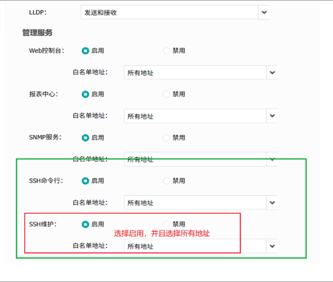 1. 需要开启SSH端口,开启方式:【系统管理】→【用户管理】→【角色】中编辑guest角色,开启SSH端口