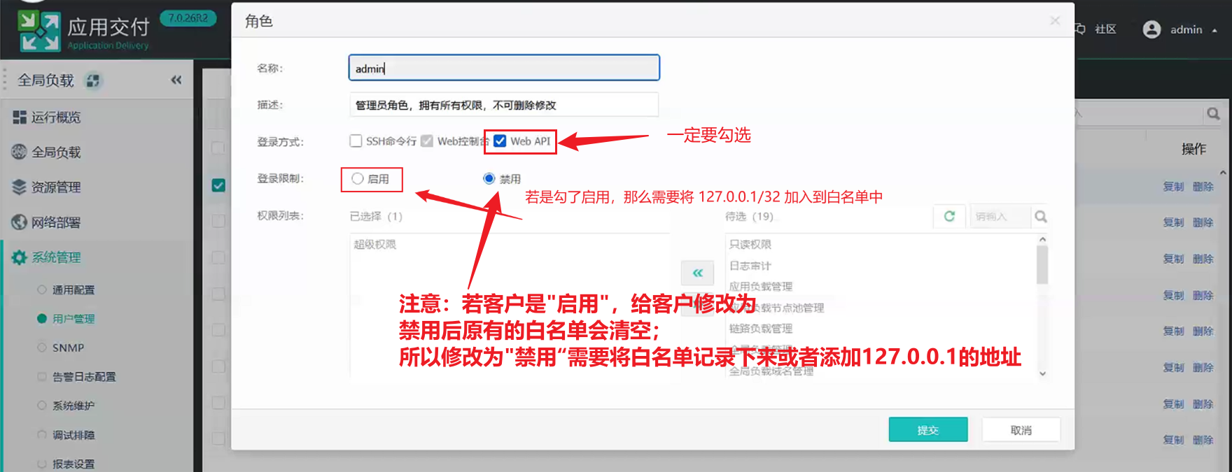 1. 从7.0.26版本开始,就默认把wei api默认关掉了,所以若巡检需要在【系统管理】→【用户管理】→【角色】勾选上【web API】,若开启了IP登录限制,那么白名单需要加入 127.0.0.1/32 这个IP才可以巡检