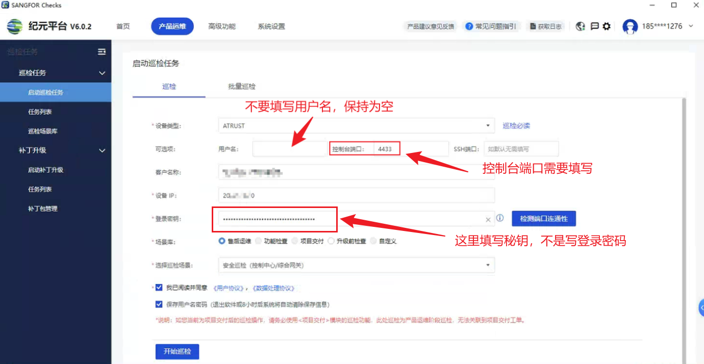 1. aTrust巡检所使用的密码,需要使用【系统管理】-【系统运维】-【设备巡检】位置,开启aCheck巡检后,生成的密钥,做为巡检密码。而非使用admin账号对应的密码。请务必重点注意。