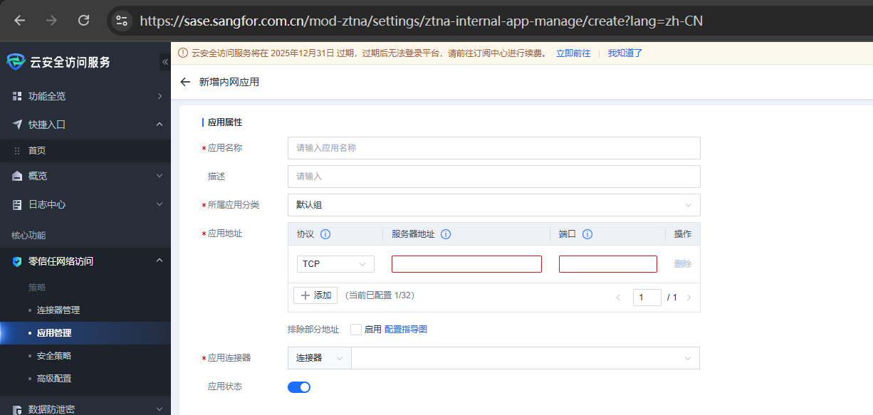 登录云图,进入云安全访问服务,进入【核心功能】-【零信任网络访问】-【策略】-【内网应用】-【内网应用管理】,点击新增。