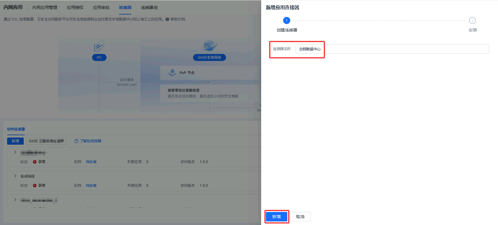 2、准备好要接入SASE平台所属数据中心的服务器环境,输入对应数据中心连接器的名称(连接器的名字可以自定义,支持英文、中文和特殊字符),例如:“总部数据中心”,添加一个新的连接器