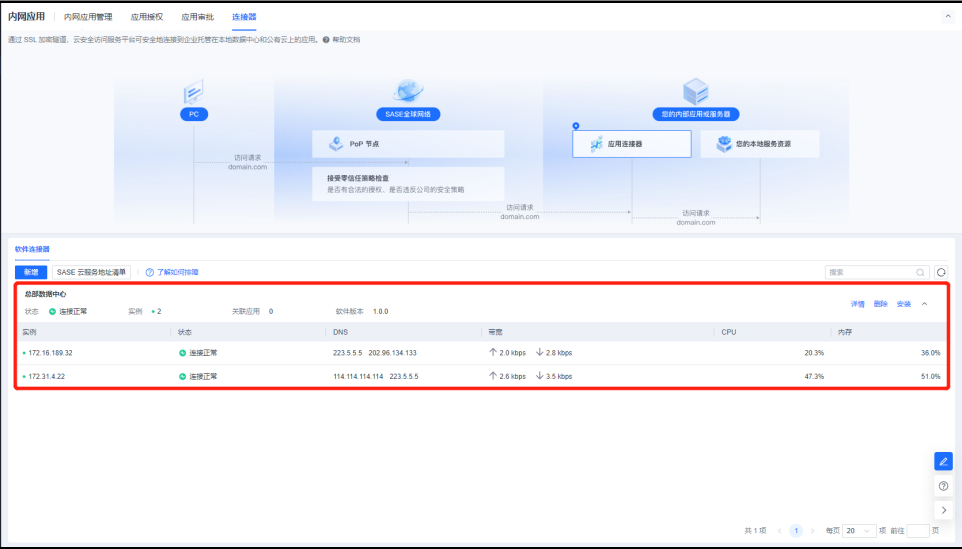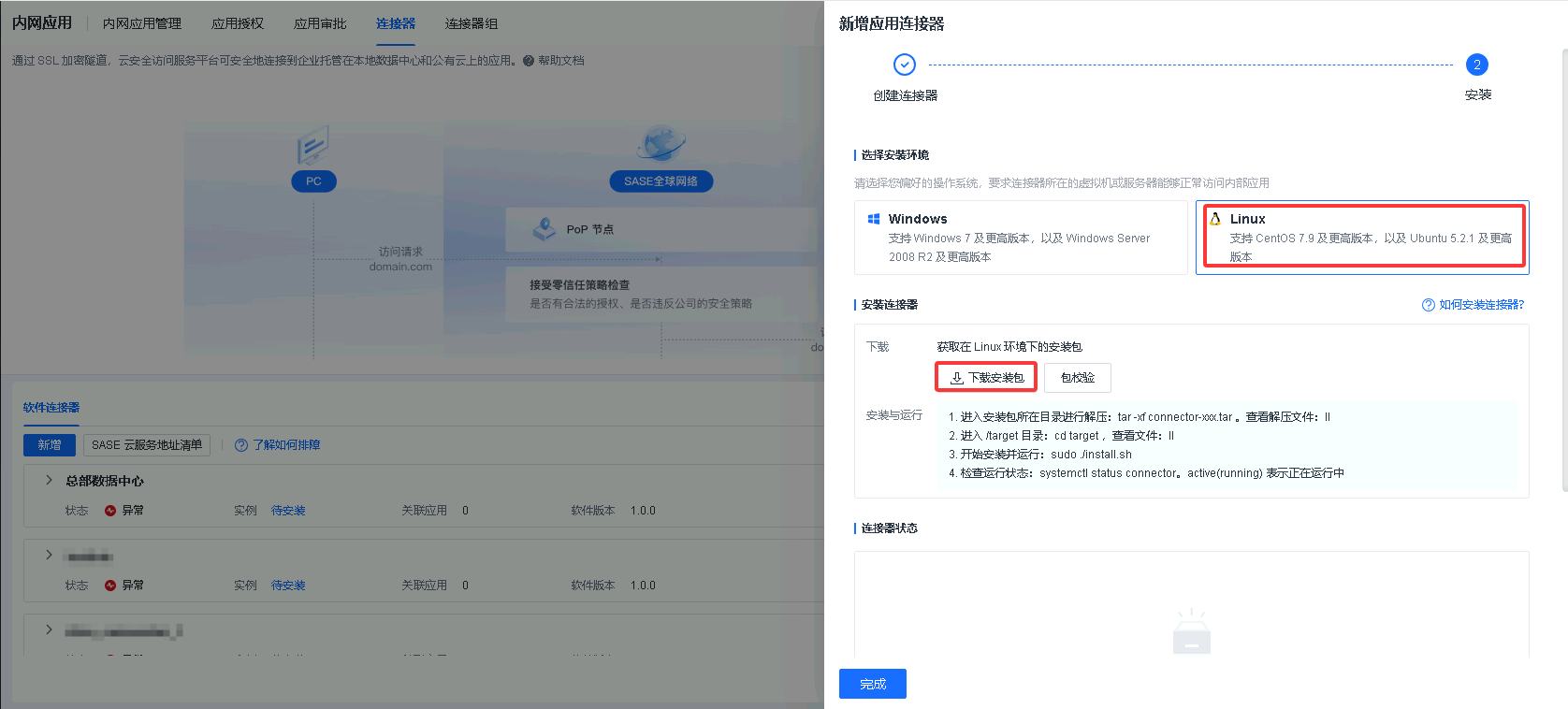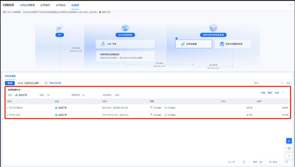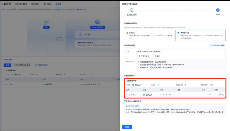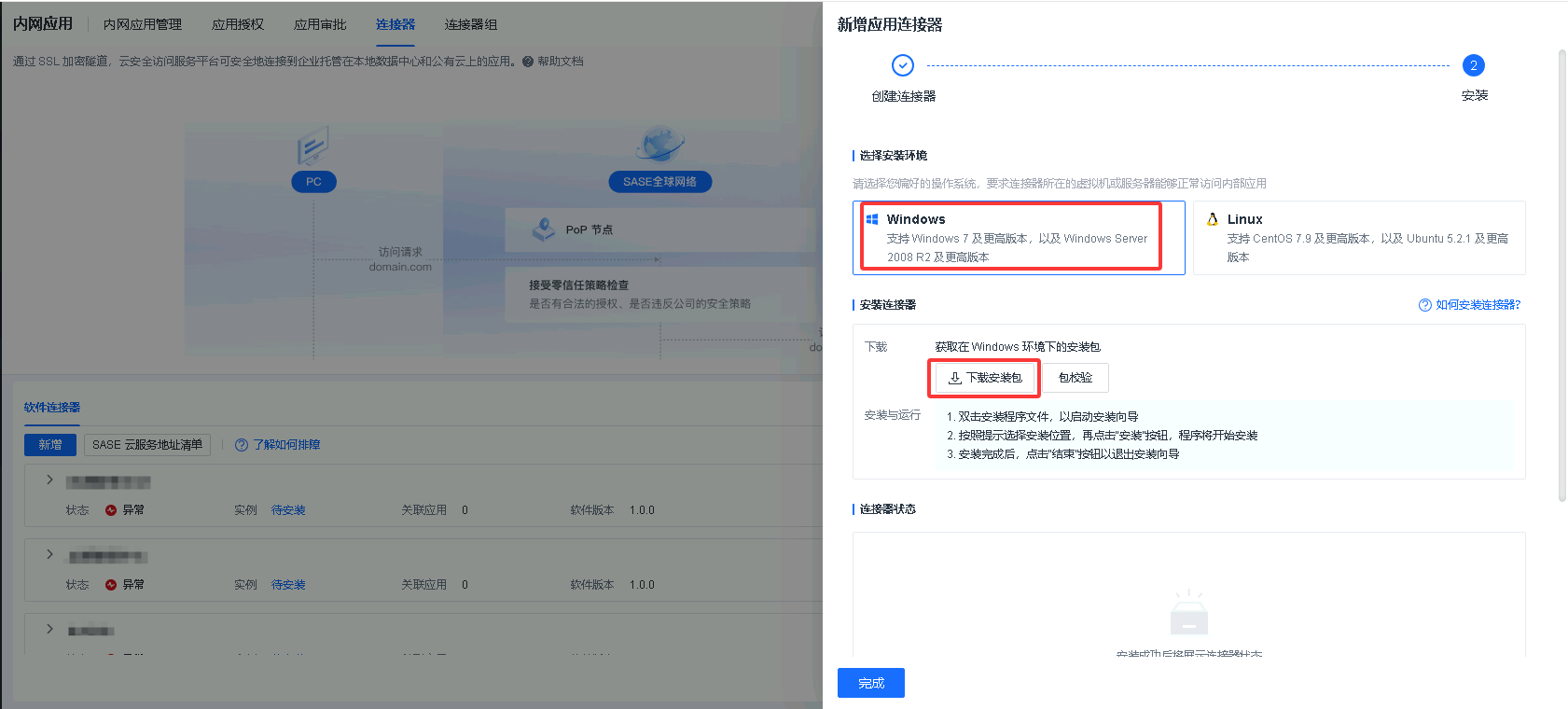 连接器的作用是通过 SSL 加密协议与POP建立隧道,客户端用户通过连接器安全地访问到企业本地数据中心或公有云上的应用。