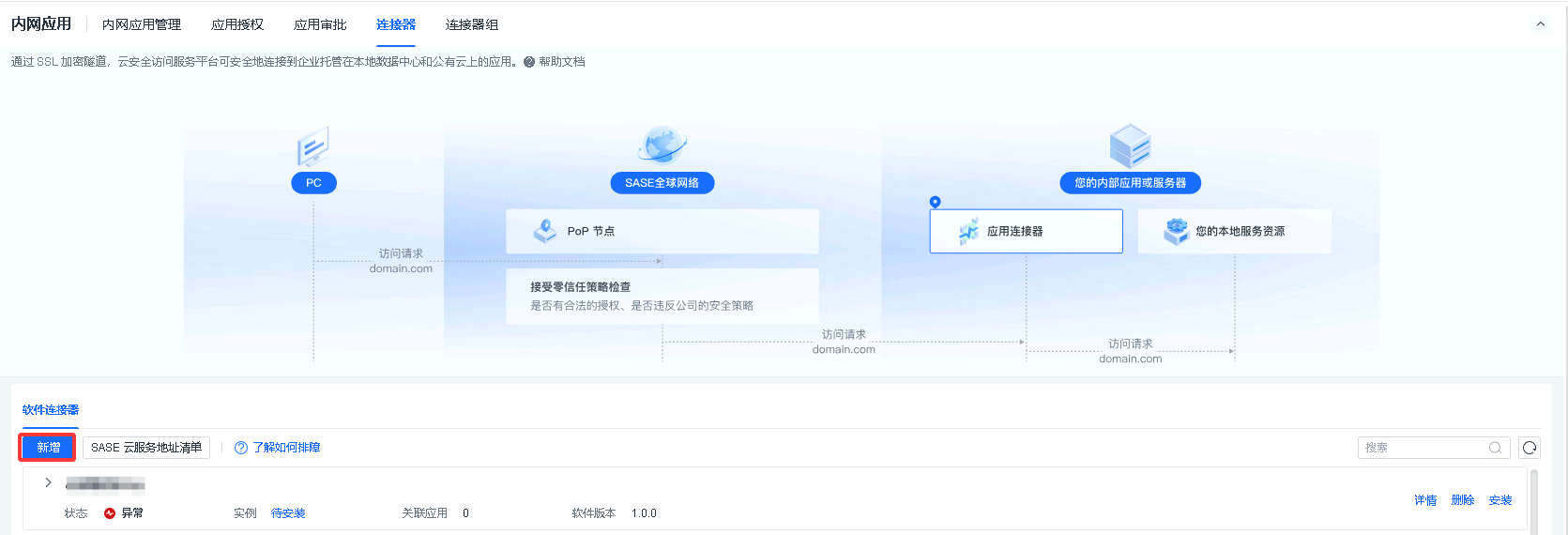 1、登录云图平台,进入云安全访问服务平台,在左侧导航栏中,点击[策略/零信任网络访问/内网应用/连接器]页面中,点击[添加连接器]按钮,进行连接器新增: