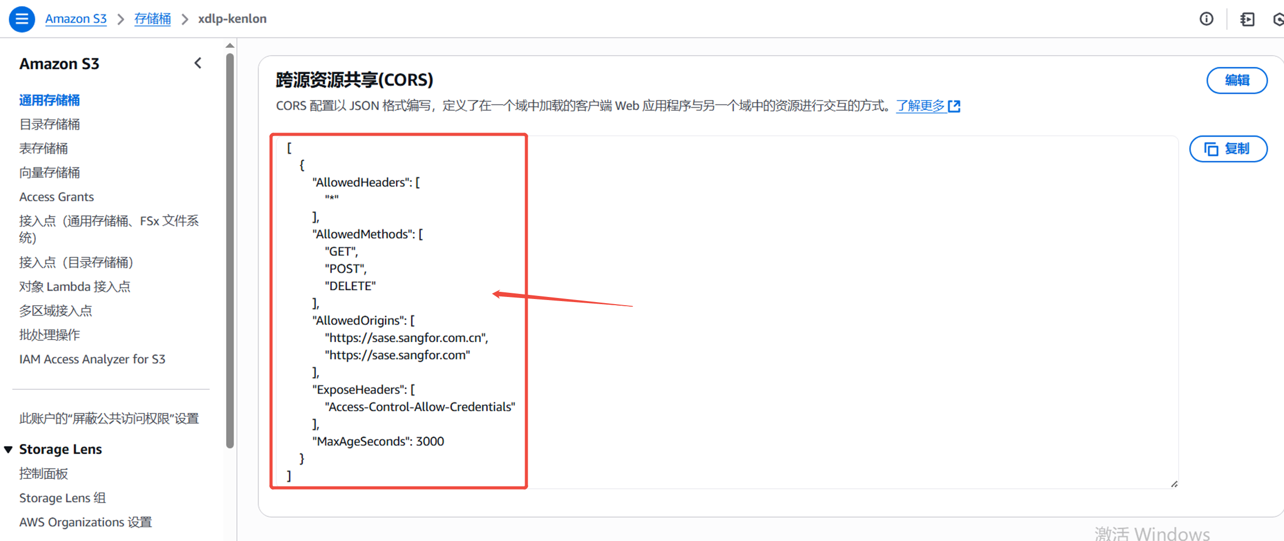 4、设置跨域白名单。进入到对应的存储桶,进入【权限】的Sheet页,拖拽的最下边。将下列内容拷贝进去替换配置即可。