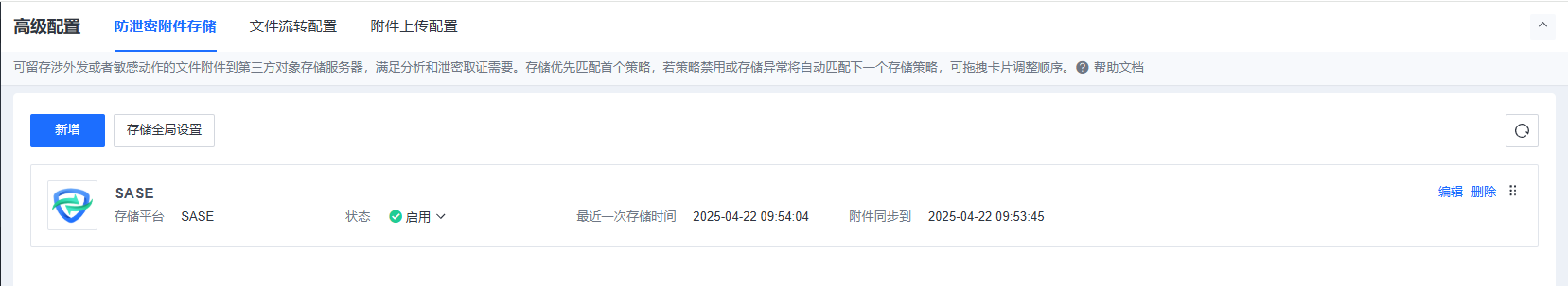 2、默认会有SASE云平台的存储桶,点击<编辑>,可以修改基本信息,或存储平台,点击<确认>提交保存。(SASE平台默认提供180天的存储时长,超过时长会从最早的内容开始删除)
