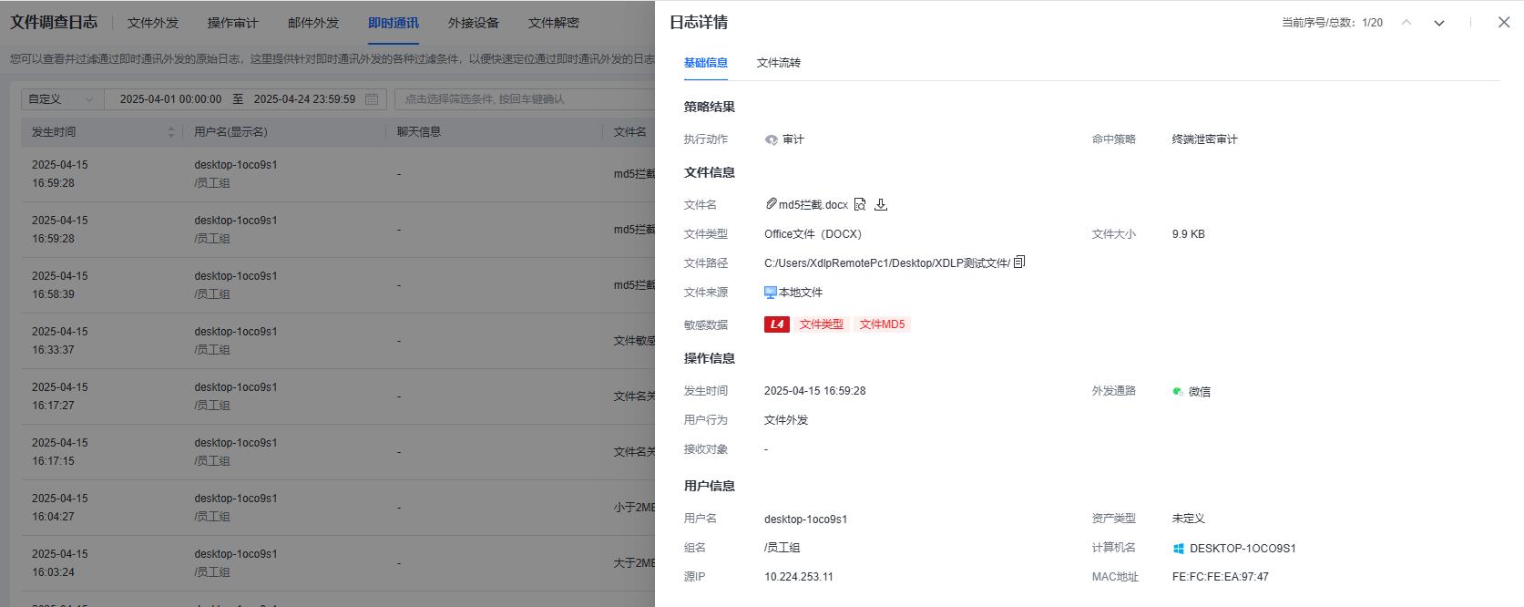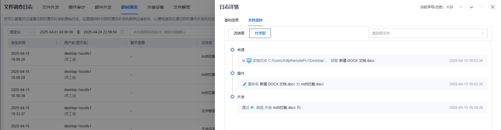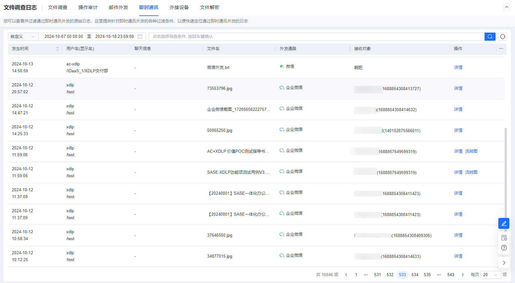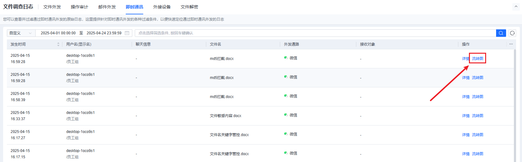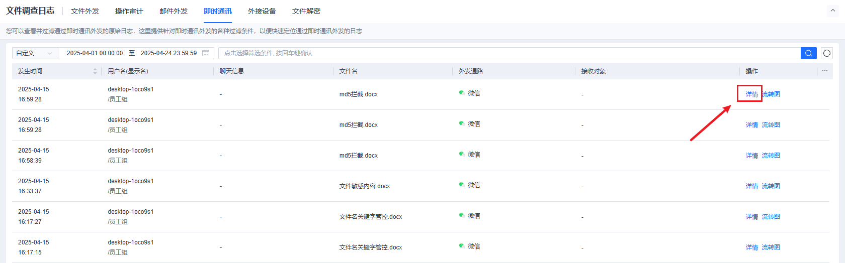 可以查看并过滤通过即时通讯外发的原始日志,这里提供针对即时通讯外发的各种过滤条件,以便快速定位通过即时通讯外发的日志