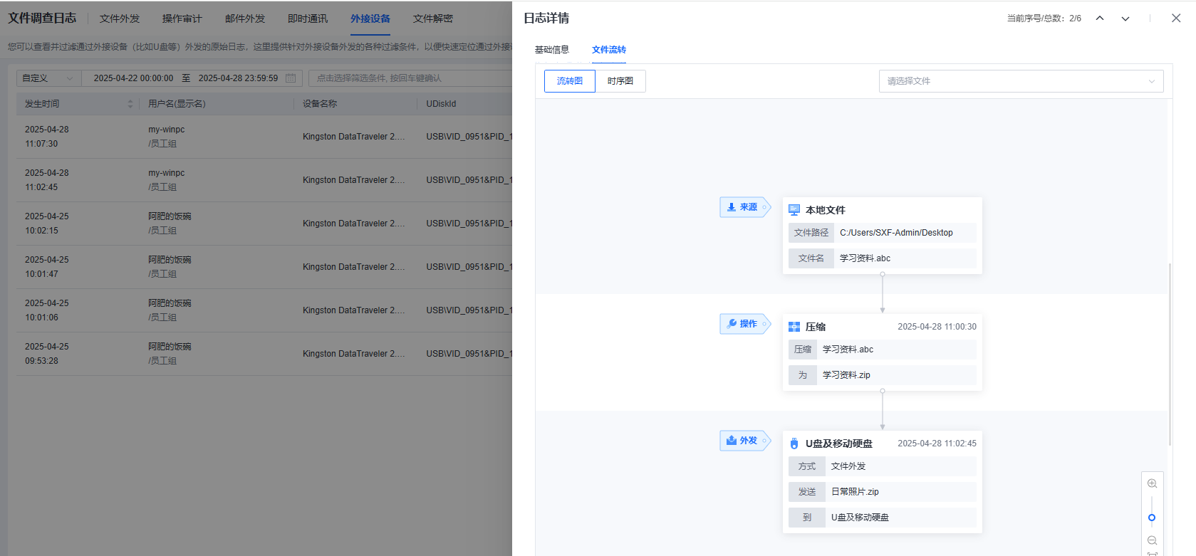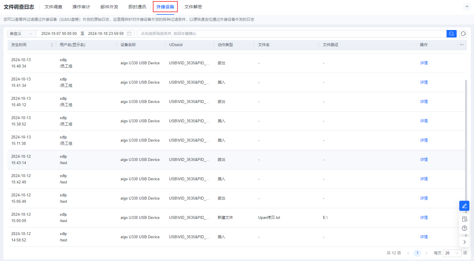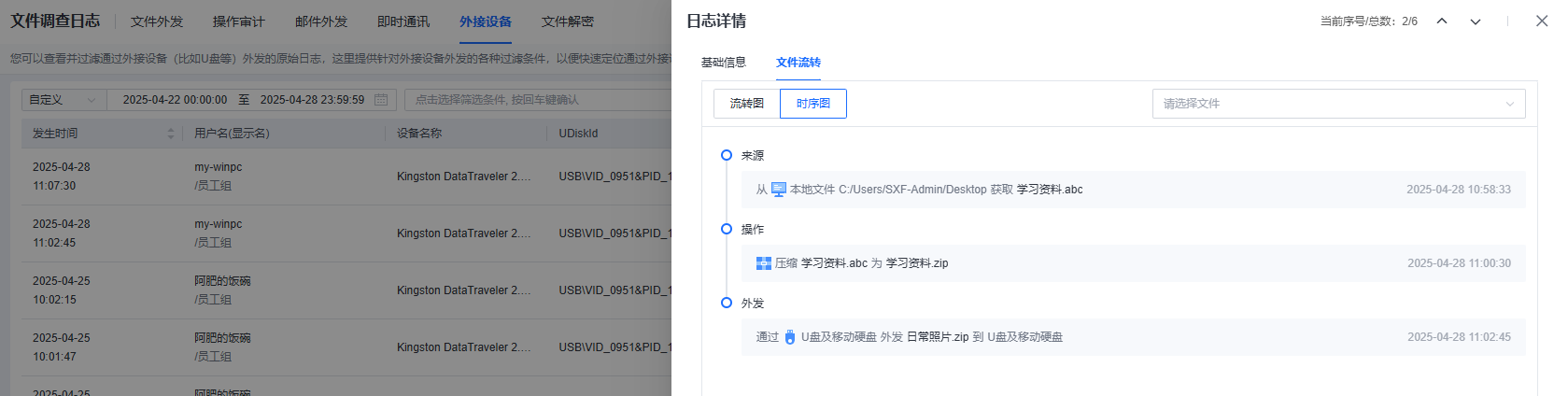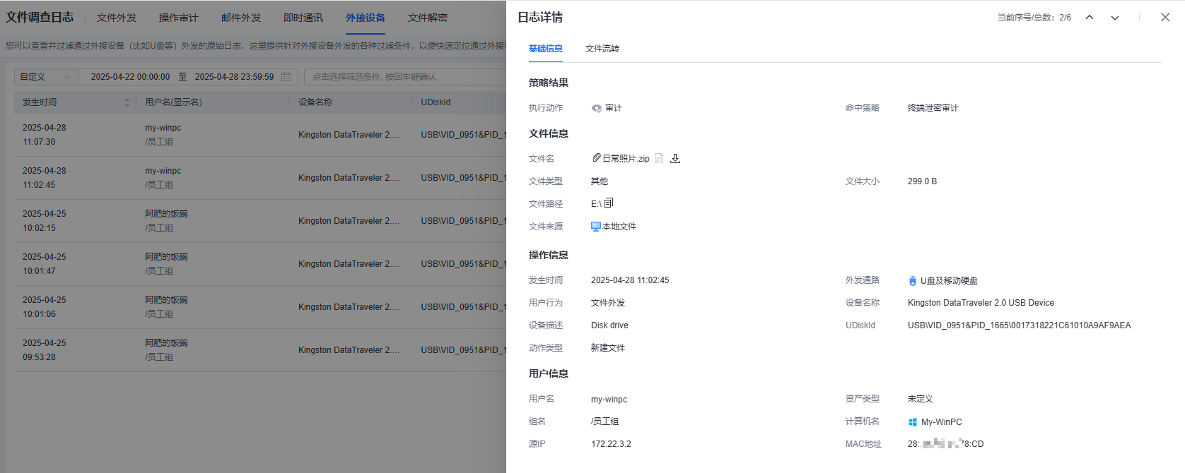 可以查看并过滤通过外接设备(比如U盘等)外发的原始日志,这里提供针对外接设备外发的各种过滤条件,以便快速定位通过外接设备外发的日志。
