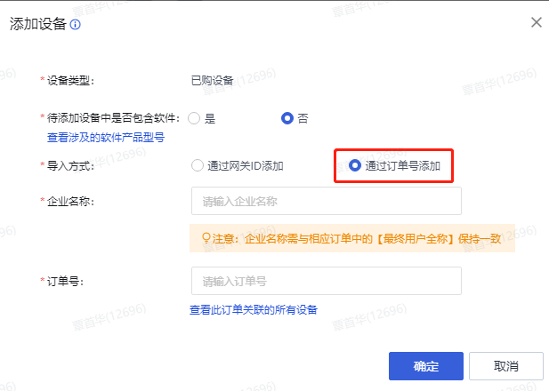 选择【通过订单号添加】,填写订单号和订单的最终用户名