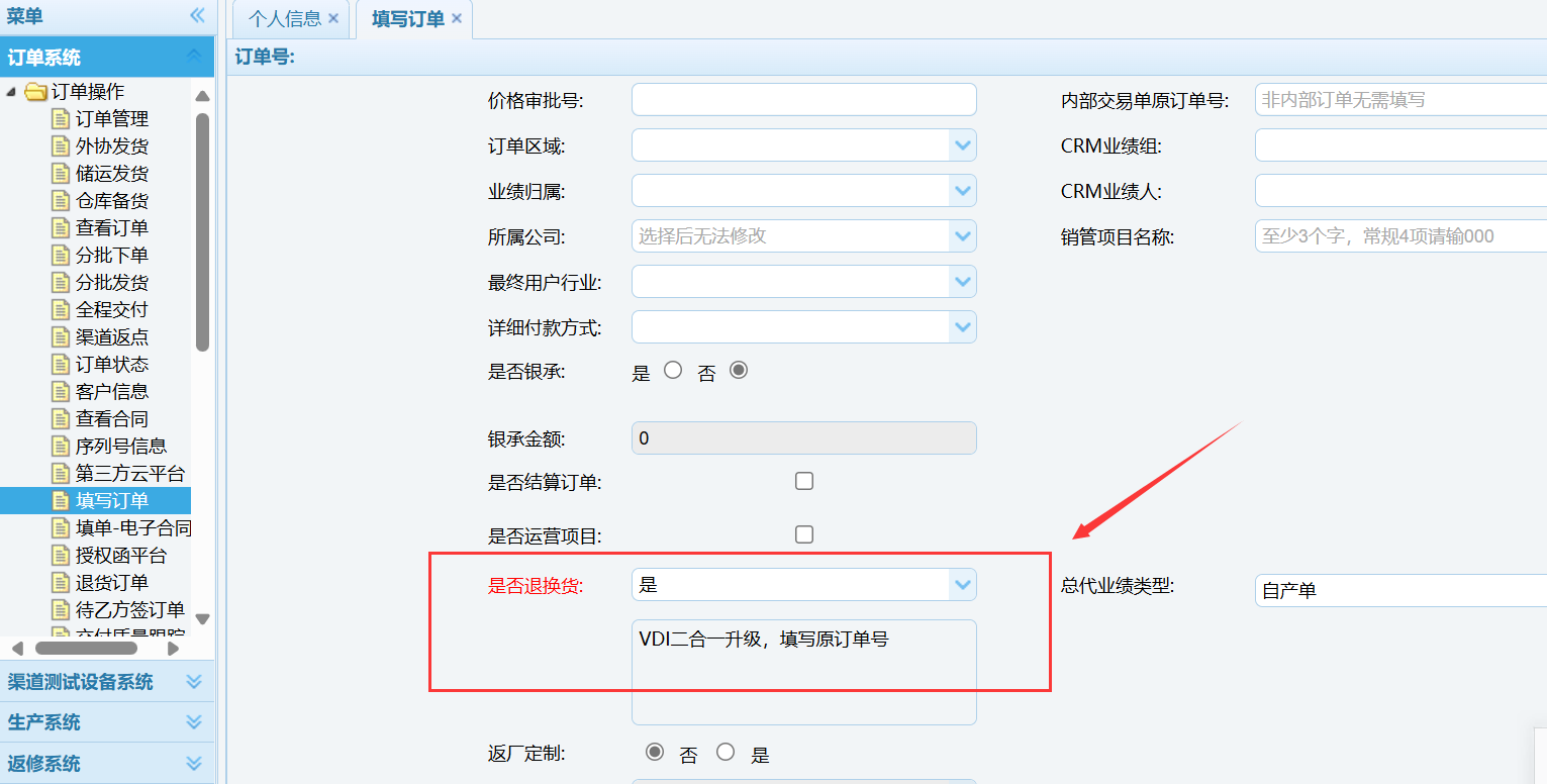 (2)记录好上述的授权变更内容,登录订单系统,点击【填写订单】进行下单,需要注意在【是否退换货】处选择是,并备注VDI二合一升级,同时将原项目产品订单号复制上去: