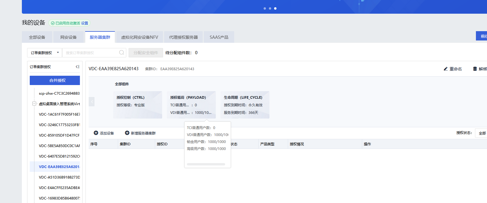 (4)订单审批完成后,登录深信服授权中心,可在服务器集群—订单集群授权处查看对应的HCI和VDC授权,并点击导出授权文件即可: