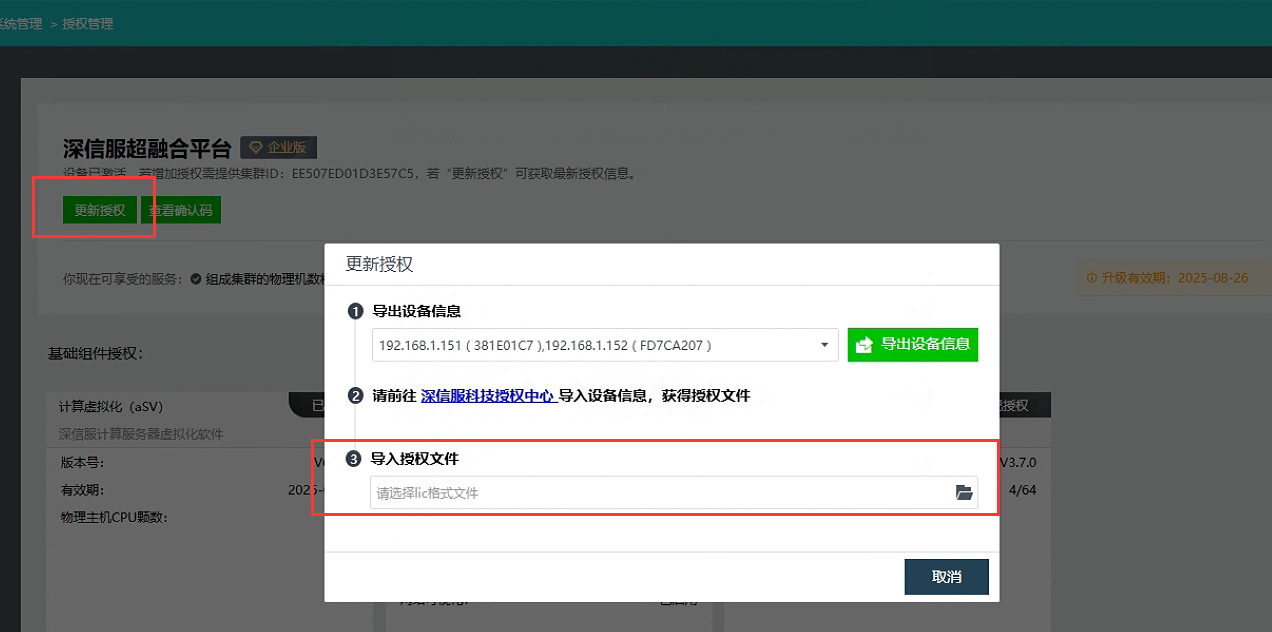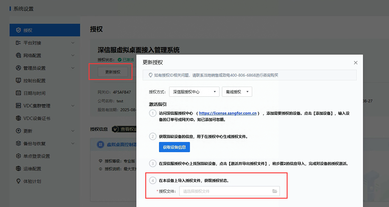 (5)将重新激活的授权文件导入VDC(在系统设置处更新授权)和HCI(在系统管理-授权管理处更新授权):
