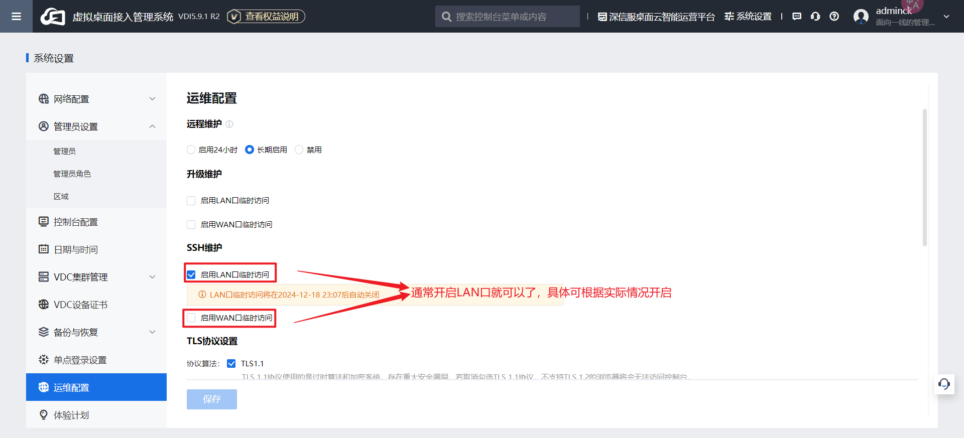 1. 登录VDI控制台,【系统设置】→【运维配置】→【SSH维护】,根据现场环境实际情况开启