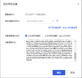 点击【手动上传设备信息】,可以将文件复制出来,或者直接上传文件进行绑定