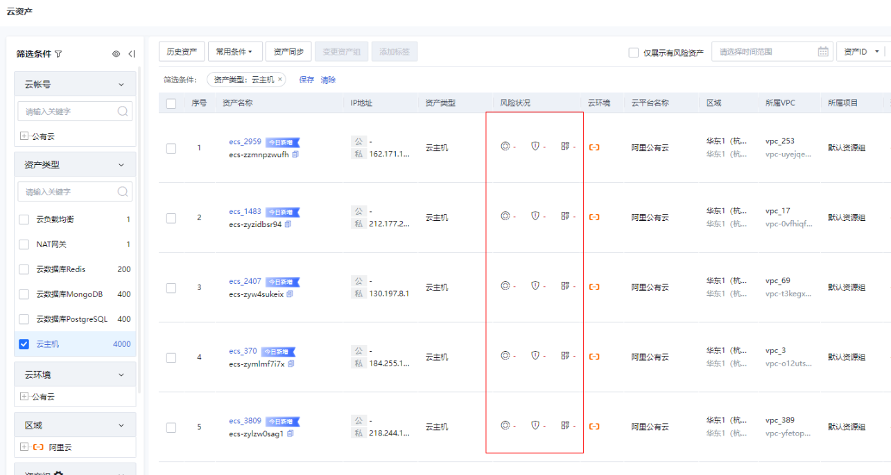 云安全中心可以拉取已经对接过的各种云厂商云上的实例资产,例如阿里云、华为云、腾讯云。便于用户统计云上的实例信息从而更好的管理云平台。同时能够识别资产的潜在风险,为客户自管理资产安全提供有效方案。