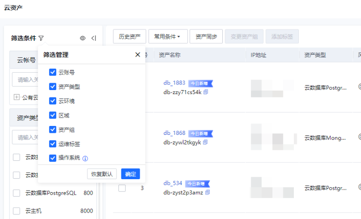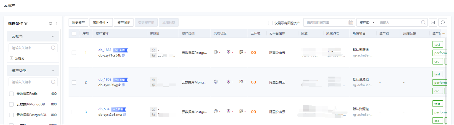 在接入云账号的前提下,云安全中心能够自动和手动的同步云上各种资产,并且能够自动识别历史资产。云安全中心资产模块支持各种资产的筛选,便于用户更好的管理云上资产。资产中心立即检查能够检查云上资产的风险问题并存储在本地数据库,查看资产详情能够查看资产的基本信息,暴露风险以及配置风险。用户一旦从云安全平台删除云账号,对应的资产也会同步删除。