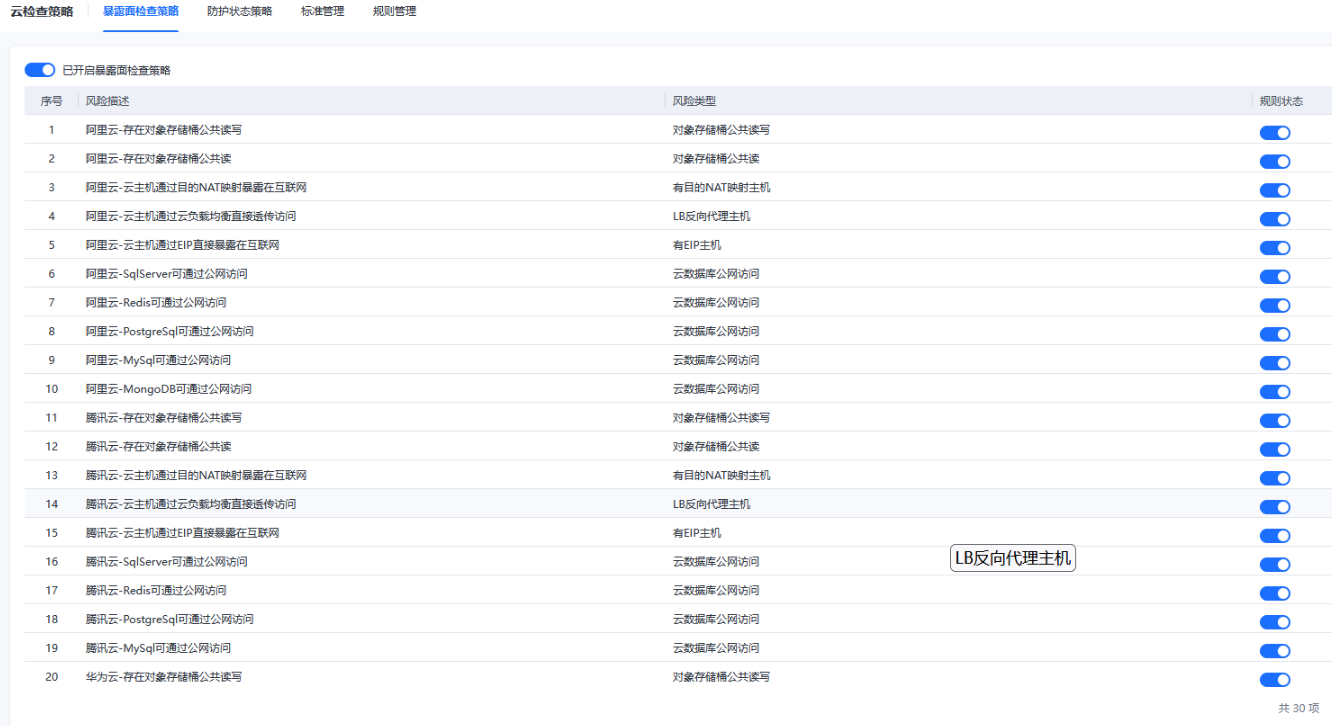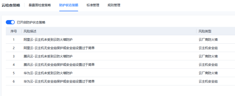 云检查策略包括暴露面检查策略配置、防护状态检查策略配置、配置风险中的标准管理和规则管理。