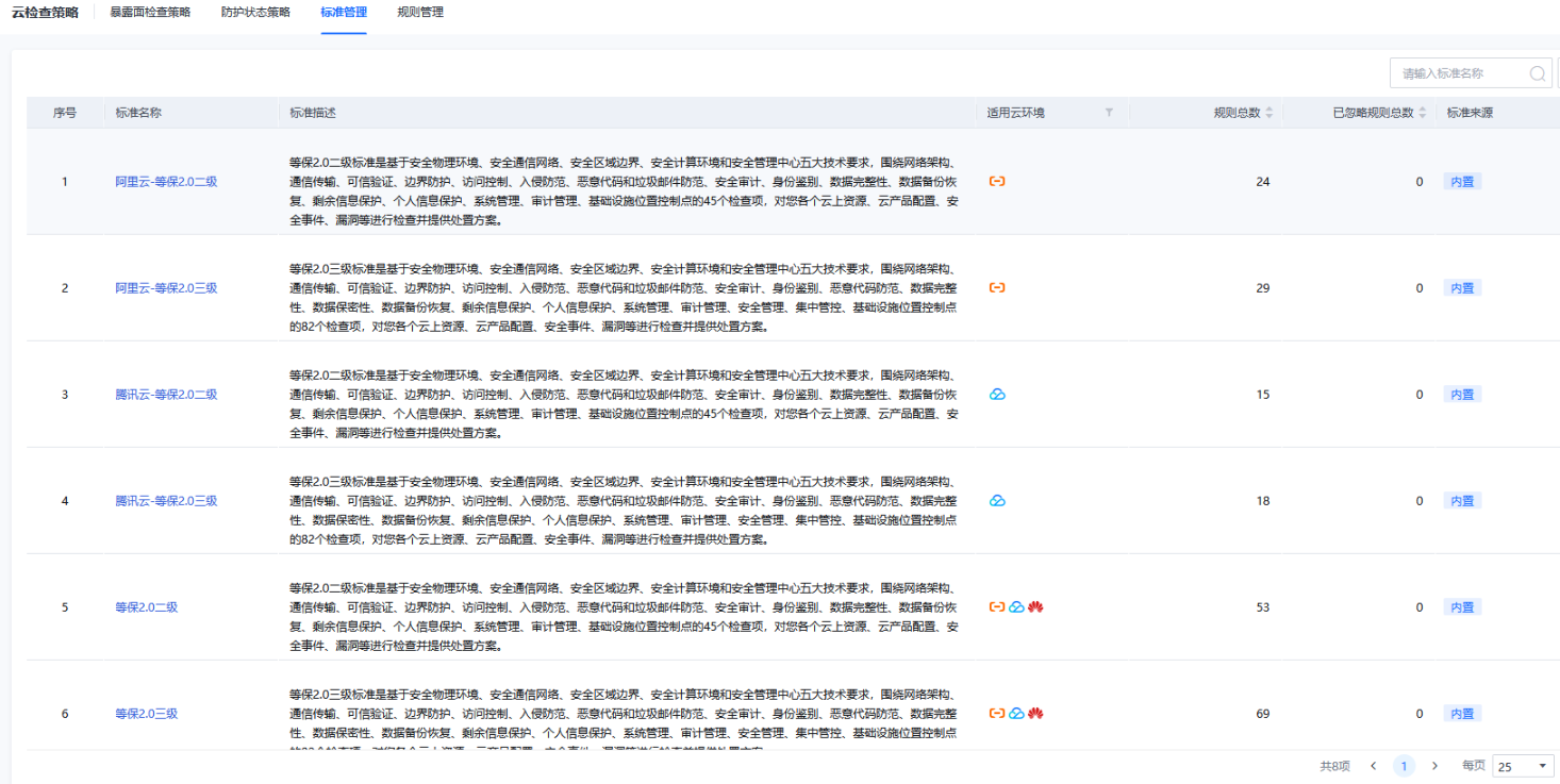 标准备管理用于查看配置风险检查中定义的标准和规则,主要指云上资产配置风险检查等保标准。