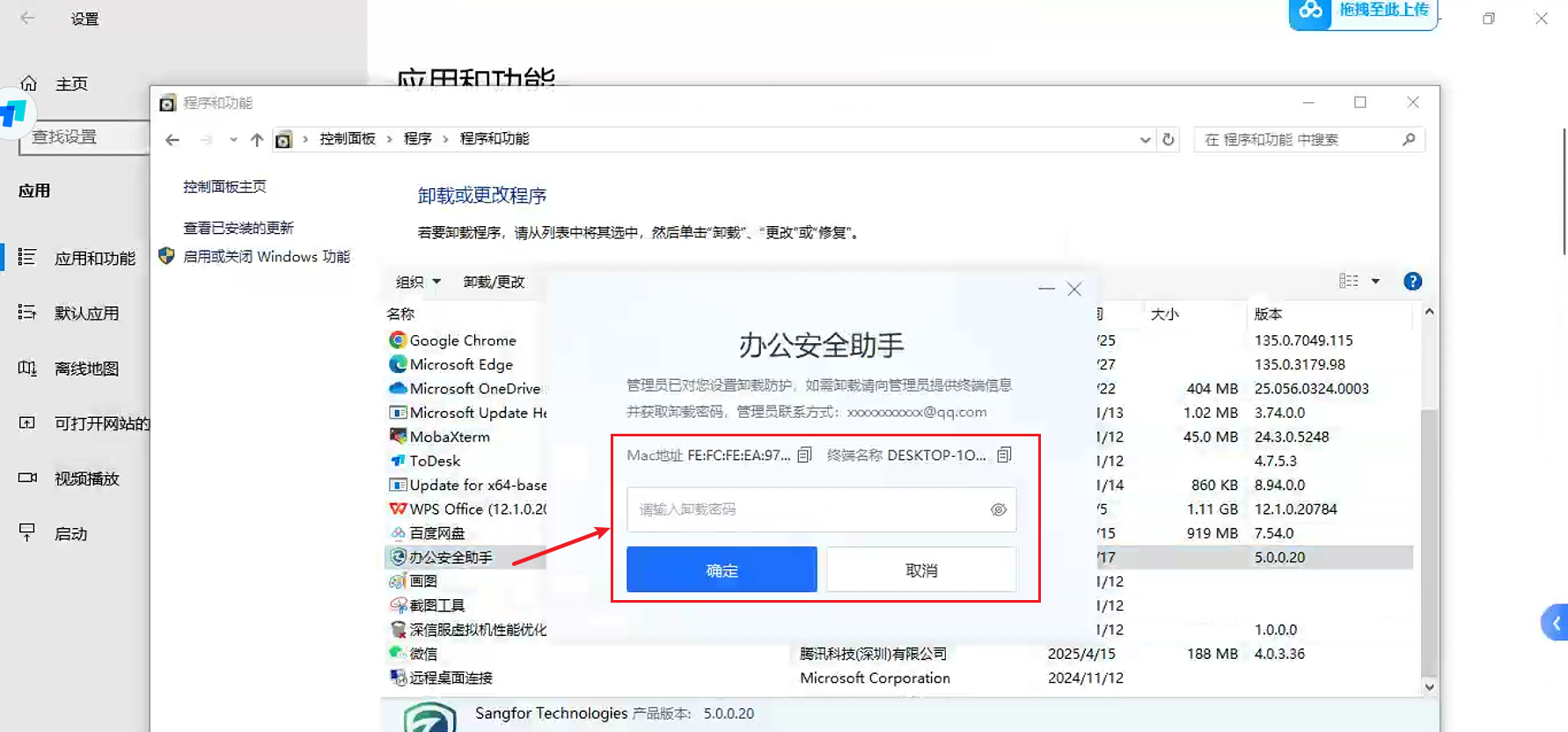 //配置下发后,终端用户通过控制面板卸载客户端需要输入卸载密码。